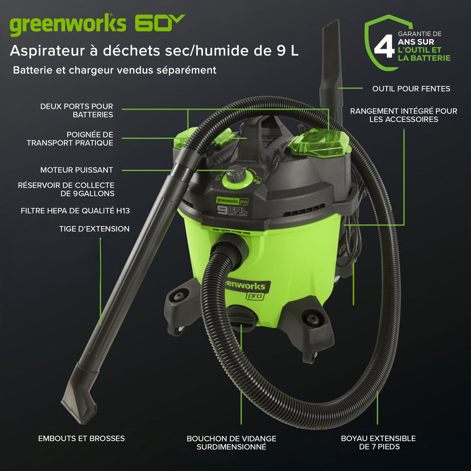- Est-ce que ça marche sans batteries (aspirateur à déchets secs/humides 60 V 9 gallons [34,07 L] CA/CC) ?