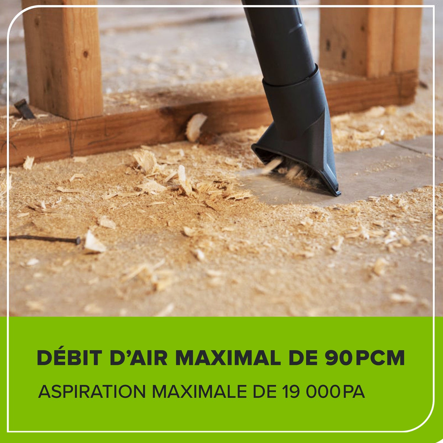 - En mode souffleur, bénéficiez d'une puissance maximale avec des vitesses de vent allant jusqu'à 90 CFM et une autonomie allant jusqu'à 30 minutes.