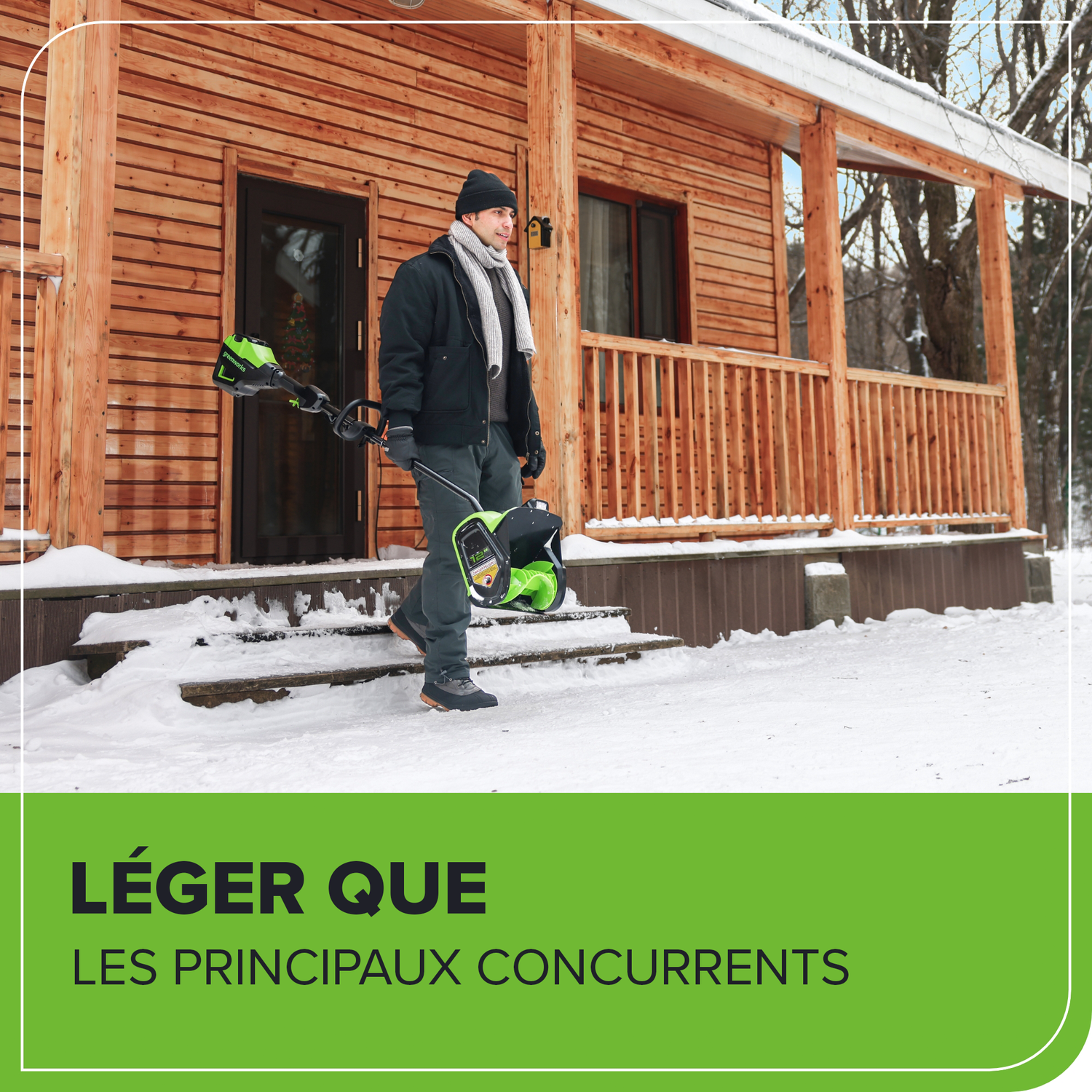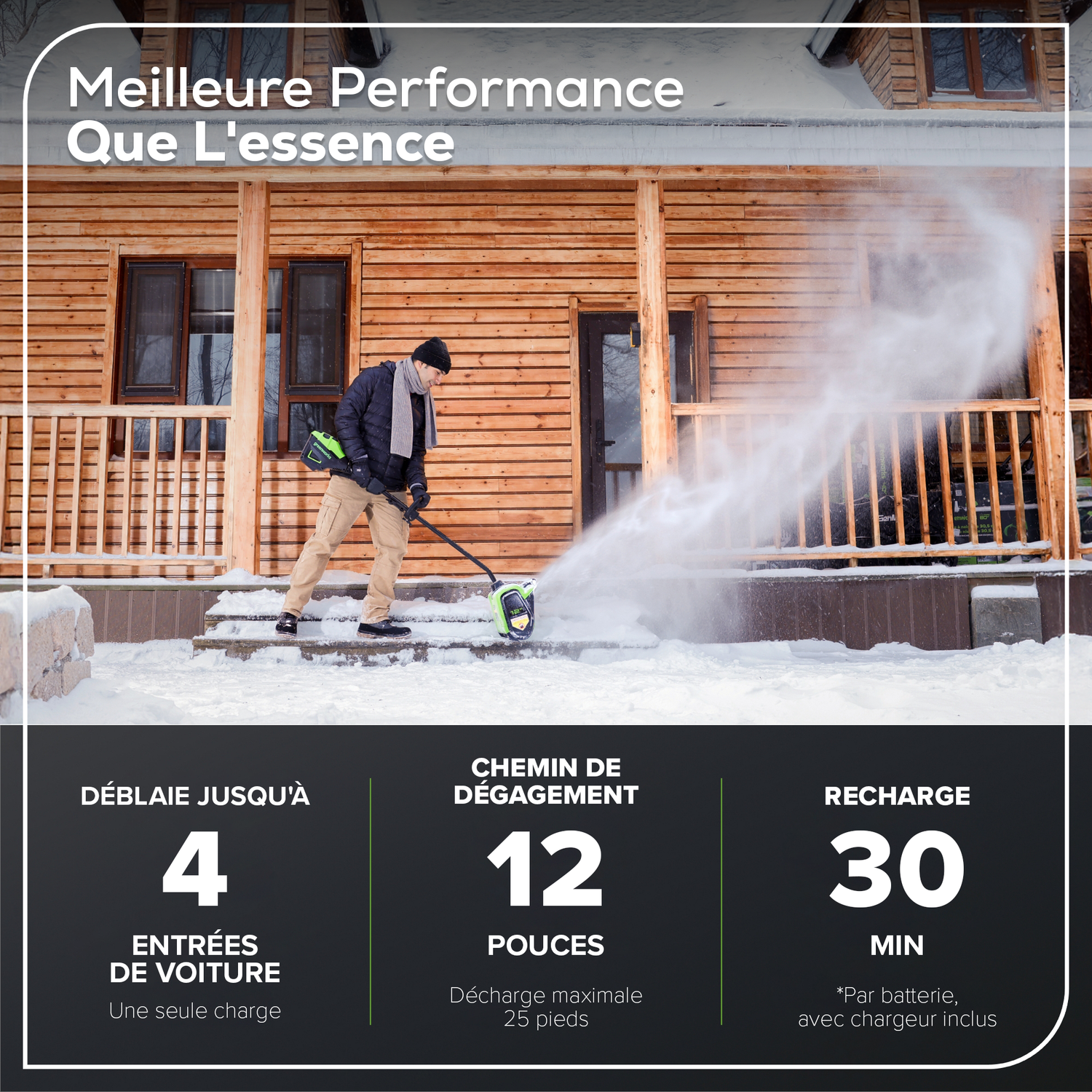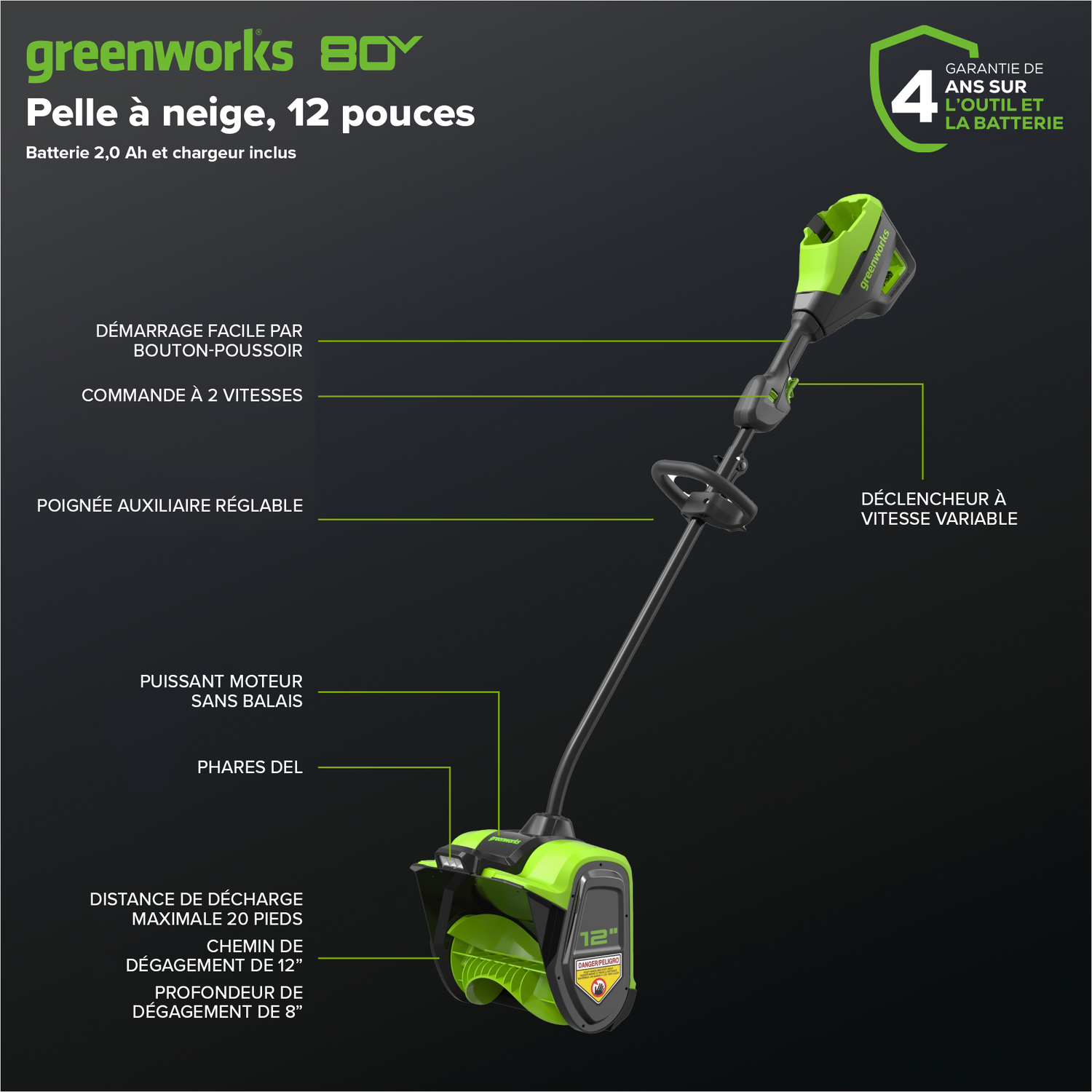 Bienvenue à La Vie. Propulsée. Par Greenworks. Facilitez le dégagement des trottoirs et des entrées cet hiver avec la pelle à neige sans balais Greenworks 80 V 12 po. Construite avec un moteur sans balais à haut rendement de 2,5 kW et une turbine à deux vitesses offrant des vitesses allant jusqu'à 2 500 tr/min, cette pelle à neige impressionnera à coup sûr. DEL lumineuse les lumières et le fonctionnement silencieux le rendent pratique pour une utilisation tôt le matin ou tard le soir. Alimenté par une batterie lithium-ion de 80 V, il présente une largeur de dégagement de 12 pouces et une profondeur de dégagement de 6 à 8 po. Dites adieu au gaz cet hiver et bonjour à Greenworks. Cette pelle à neige est compatible avec le système complet d'outils et de batteries Greenworks 80V. Bénéficiant d'une garantie de 4 ans, cette pelle à neige est conçue pour durer des années.