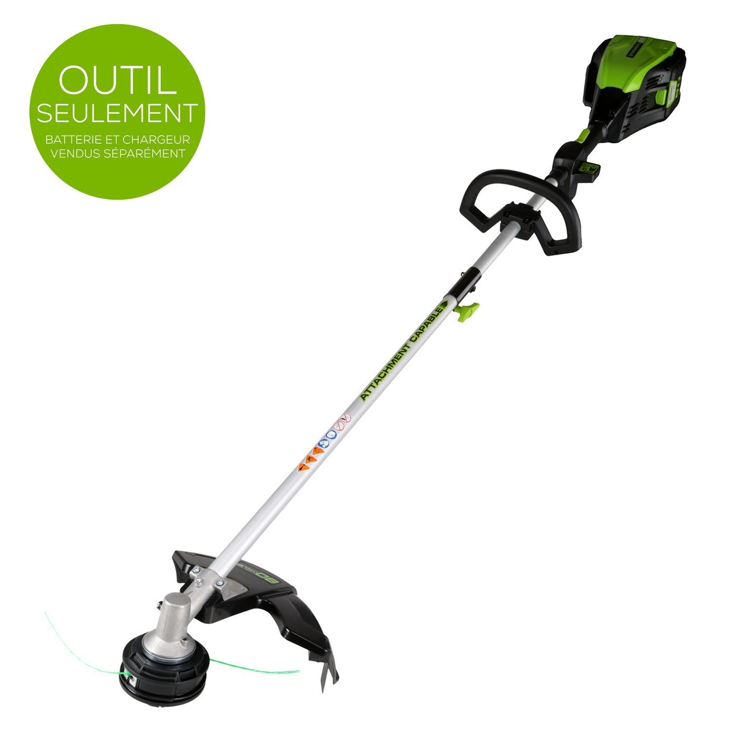 Bienvenue à La Vie. Propulsée. Par Greenworks. L'aménagement paysager n'a jamais été aussi simple avec le système Greenworks Pro 80 V; la plate-forme de batterie sans fil la plus puissante des équipements électriques extérieurs. Commencez avec une trousse à outils, puis ajoutez un équipement contenant uniquement des outils. Ce coupe-herbe peut être utilisé avec tous les modèles de batterie Greenworks 80 V ! Vous pouvez désormais effectuer facilement vos travaux de jardinage sans gaz, sans émission et sans entretien. Passez de zéro à la puissance en appuyant simplement sur un bouton et accomplissez la tâche à accomplir avec moins de vibrations, moins de bruit et moins de dégâts. Effectuez toute votre tonte en un rien de temps avec le coupe-herbe Greenworks 80 V de 16 po compatible avec les accessoires. Ce coupe-herbe sans fil est doté d'une trajectoire de coupe de 16 pouces, d'un moteur sans balais et peut être utilisé avec la plupart des marques d'accessoires. De plus, tous les outils Greenworks Pro 80 V incluent une garantie limitée de 4 ans sur les outils et la batterie pour garantir la protection de votre investissement.
