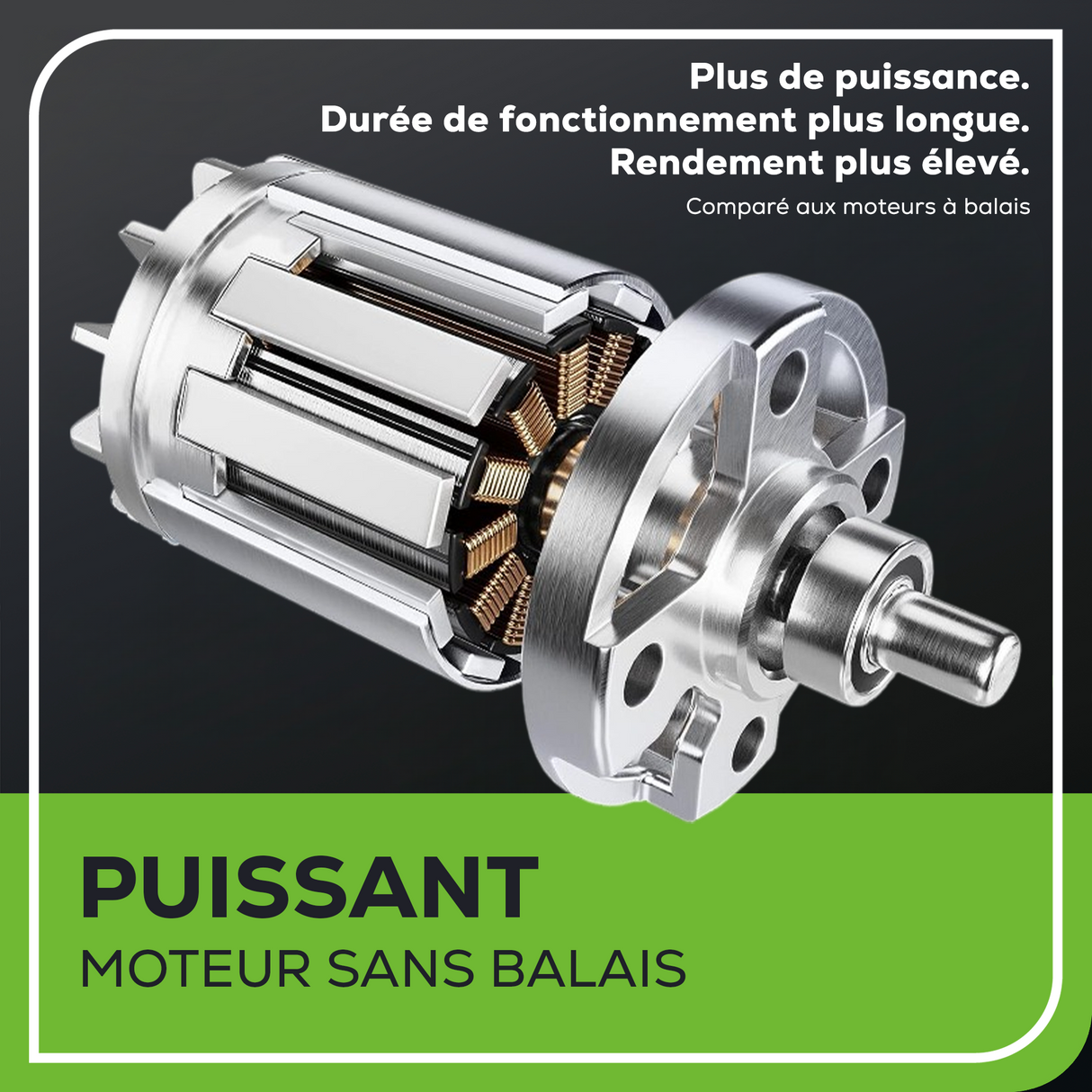 - PERFORMANCES Le moteur sans balais hautement efficace offre un couple accru, des durées de fonctionnement plus longues, un fonctionnement silencieux et une durée de vie prolongée du moteur. Équipé de la technologie innovante Smart Cut pour ajuster automatiquement la vitesse de la lame lorsque plus de puissance est nécessaire pour la meilleure coupe possible.