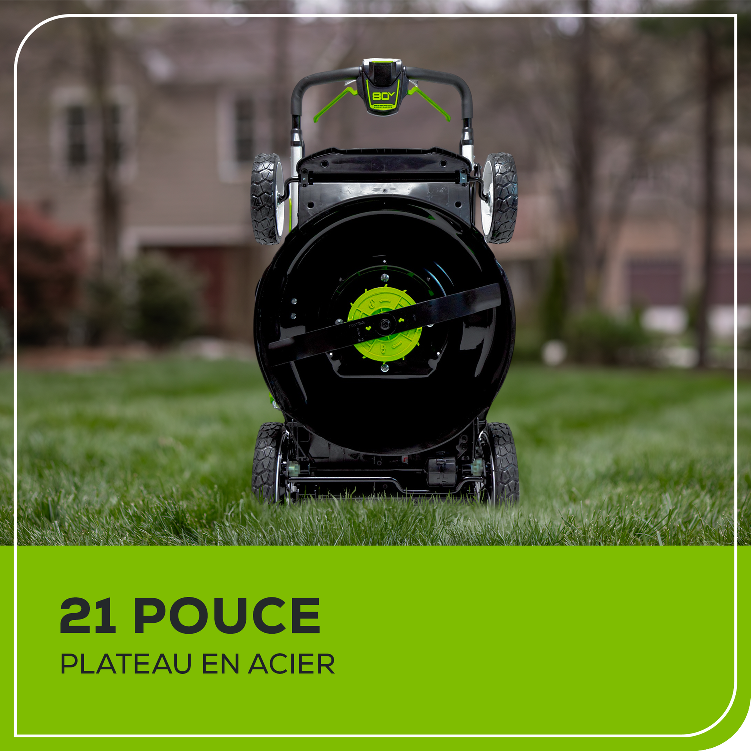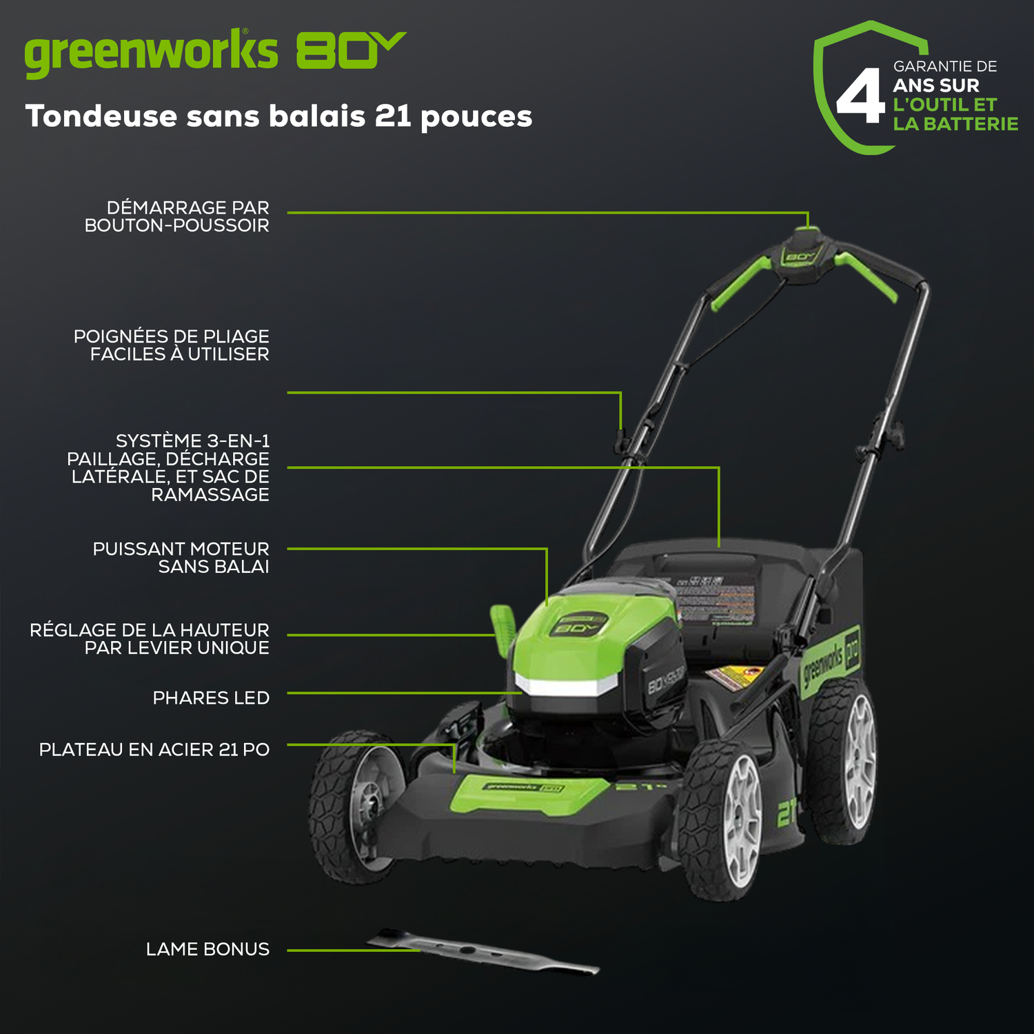 Bienvenue à La Vie. Propulsée. Par Greenworks. Lorsqu'il s'agit d'équipement électrique extérieur, vous mettez l'accent sur la « puissance ». Et pourquoi pas ? Pour les propriétaires comme vous qui entreprennent des travaux de grande ou de petite envergure, vous avez besoin d'une tondeuse sans fil alimentée par batterie avec une construction robuste et des performances de pointe durables. La gamme d'outils Greenworks Pro 80 V relève le défi avec un système de batterie universel qui fonctionne sur plusieurs produits, des moteurs à haut rendement et des fonctionnalités de pointe. Mettez l'accélérateur au bord du trottoir et passez au vert sans émanations, sans mélange, sans entretien et sans cordons de traction. Laissez Greenworks vous aider à vous débarrasser du travail dans votre jardin. Gardez votre pelouse impeccable avec la tondeuse à gazon poussée sans balais Greenworks 80 V 21 po, (2) batteries 2,0 Ah et chargeur inclus. Cette tondeuse à gazon est dotée d'un plateau en acier, de 7 hauteurs de coupe, de la technologie innovante SmartCut et de poignées repliables pour un rangement compact. De plus, tous les outils Greenworks Pro 80 V bénéficient d'une garantie limitée de 4 ans sur les outils et la batterie pour garantir la protection de votre investissement.