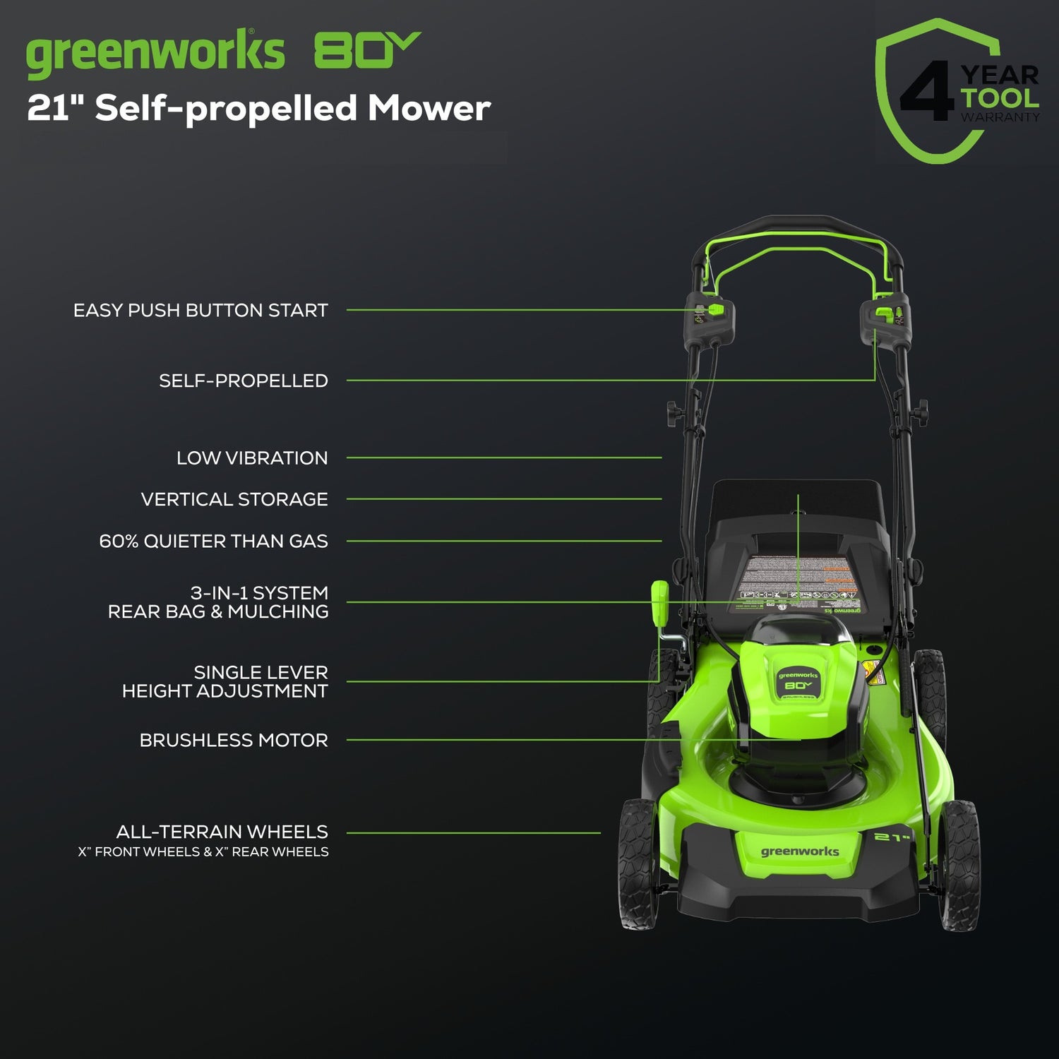 Spécifications de la tondeuse autotractée 80 V, 21 pouces, batterie 4,0 Ah et batterie 2,0 Ah et chargeur
