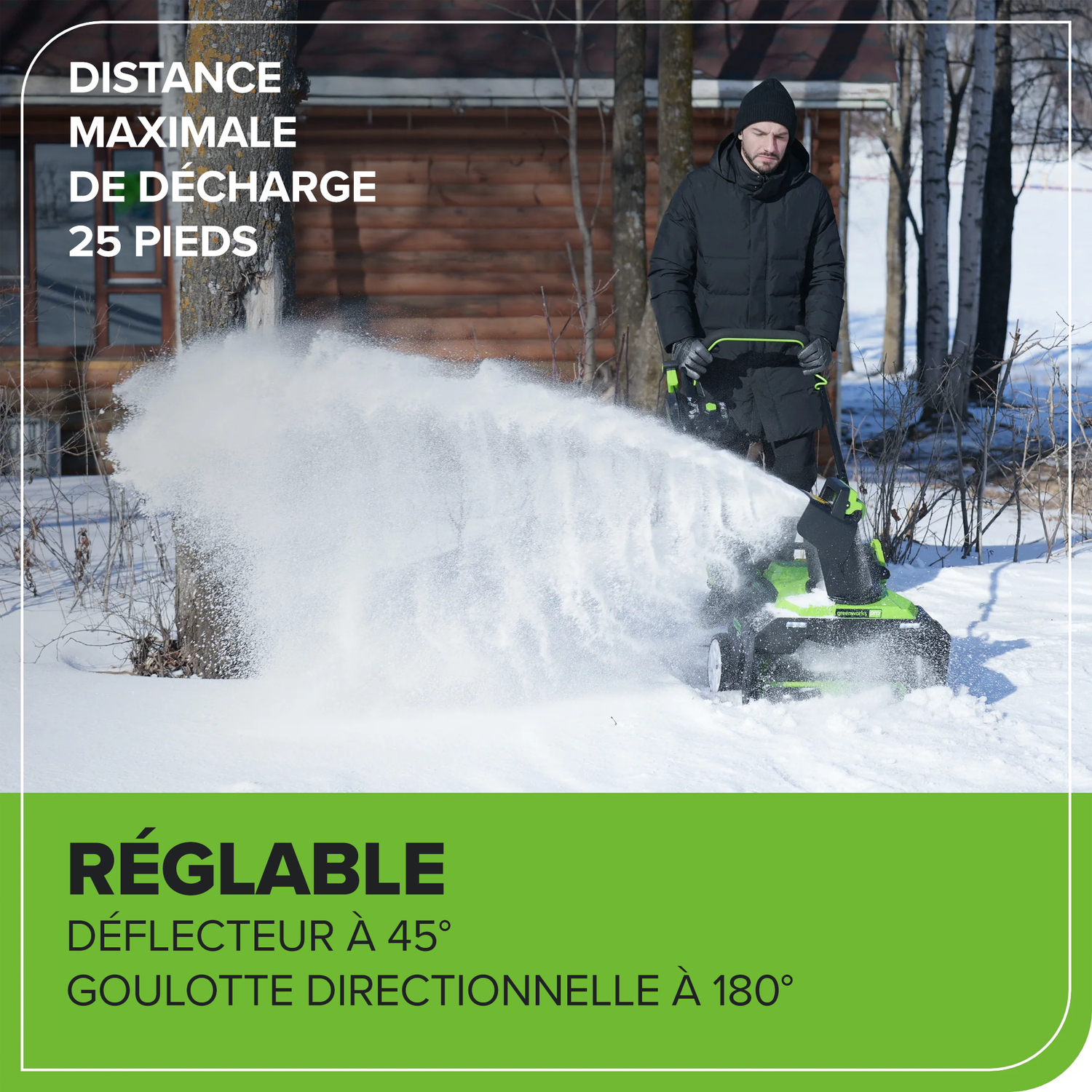 Bienvenue à La Vie. Propulsée. Par Greenworks. Idéale pour déneiger les trottoirs, les allées et les patios, cette souffleuse à neige Greenworks Pro 80V est l'outil à avoir lorsque la neige tombe. Construite avec un moteur sans balais à haut rendement et une admission de 22 pouces de large, la souffleuse à neige sans fil Greenworks Pro 80 V peut tout gérer. Ajustez facilement la tarière pour contrôler la distance de projection de la neige pour un contrôle maximal. Une goulotte robuste montée sur la poignée- Le levier de réglage donne à l'utilisateur le contrôle lors de la redirection de la neige jusqu'à 180° d'un côté à l'autre. Les lumières DEL brillantes le rendent pratique pour une utilisation tôt le matin ou le soir et le châssis en acier robuste est conçu pour une utilisation agressive dans des conditions exigeantes. Dites adieu au gaz cet hiver et bonjour à Greenworks. Cette souffleuse à neige est compatible avec le système complet d'outils et de batteries Greenworks 80V. Commencez avec un ensemble d'outils puis ajoutez un équipement uniquement pour les outils. Garantie limitée de 4 ans couvrant à la fois l'outil et la batterie, garantissant la protection de votre investissement.