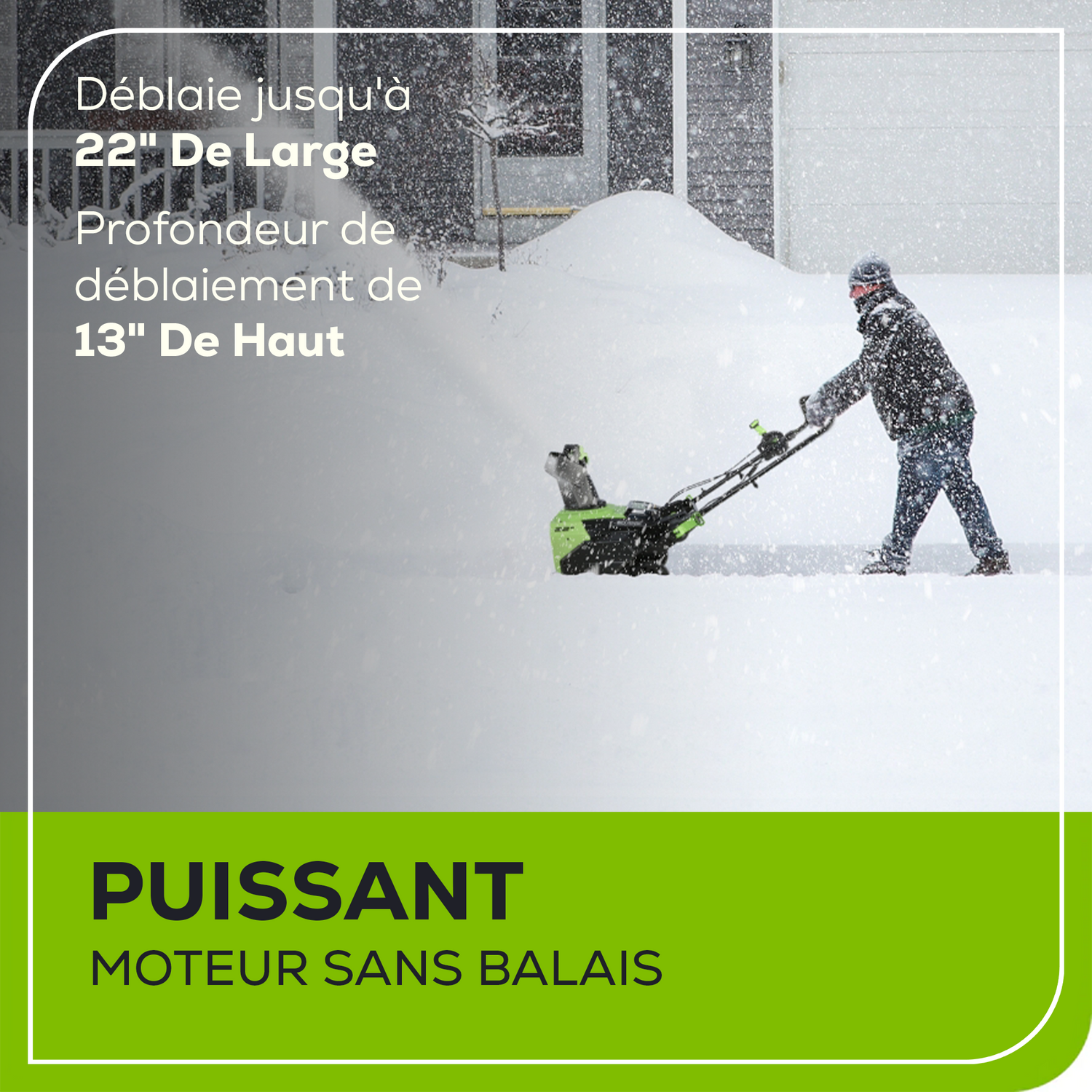 - SANS BALAIS : Moteur sans balais de 2,5 kW très efficace offrant jusqu'à 1 800 tr/min en mode éco et 1 950 tr/min en mode turbo. Dégage rapidement les allées, les trottoirs, les patios et plus encore avec un chemin de dégagement de 22 po. et une profondeur de dégagement de 13 po.
