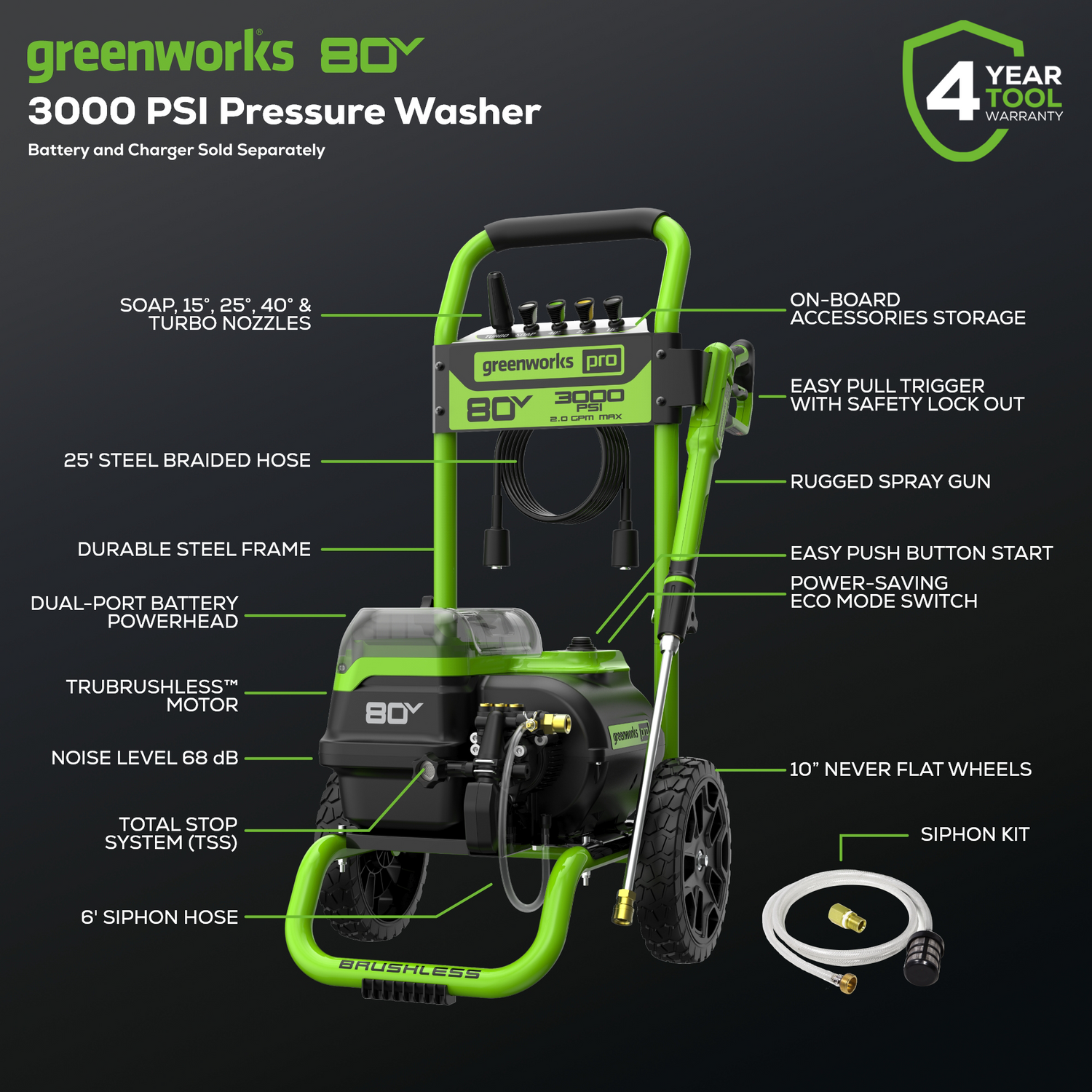 Bienvenue à La Vie. Propulsé. Par Greenworks. Les laveuses à pression résidentielles à batterie les plus puissants au monde ! Le nettoyage ménager intensif nécessite des outils aussi sérieux que vous. Qu'il s'agisse de la voiture, de la maison, de la terrasse ou de l'entrée, vos affaires brilleront à coup sûr. La laveuse à pression 80 V Greenworks 3 000 PSI (lb/po²) ne manquera pas d'impressionner. Bénéficiant d'un débit d'eau allant jusqu'à 2,0 GPM, il est puissant, fiable et conçu pour les tâches de nettoyage les plus difficiles. Avec un démarrage par bouton-poussoir sans tracas, il s'allume facilement et se met au travail rapidement. Il est doté d'un moteur et d'une pompe sans balai à fonctionnement continu de type « gaz » ; la laveuse à pression fonctionnera de manière constante lorsque l'appareil est en position « marche » et une soupape de décharge thermique purge l'eau chaude de la pompe pour la maintenir au frais. Avec un pistolet pulvérisateur en métal robuste, il est solide et durable, et la pompe est dotée d'un revêtement anodisé résistant à la corrosion. Il est équipé d'un boyau anti-pliage de 25 pieds sans tracas qui élimine les enchevêtrements de boyaux frustrants, de roues increvables de 10 pouces pour un transport facile et d'un rangement d'accessoires à bord. Bénéficiant d'une garantie moteur de 10 ans et d'une garantie outil de 4 ans, la meilleure du secteur, il est conçu pour résister à la saleté et à la crasse les plus tenaces pendant des années.