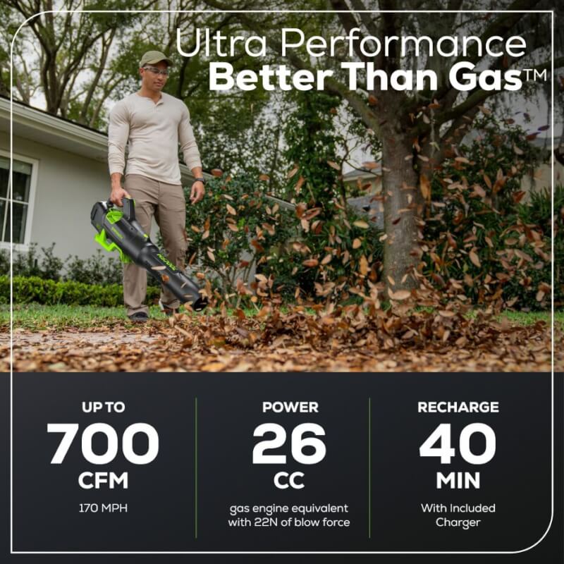 · Dépassez la puissance du gaz avec une puissance équivalente à celle d'un moteur de 28 cc, délivrant 700 CFM (pi³/min) et 170 MPH (mil/h).
