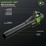 Alimenté par une batterie lithium-ion de 80 V de qualité professionnelle, le nouveau souffleur à batterie Greenworks offre une puissance et des performances typiques des souffleurs à essence, sans bruit, fumées ou émissions nocives. Avec une force de soufflage incroyable de 155 MPH (249,4 km/h) de vitesse d'air maximale et de 650 CFM (pi³/min) de volume d'air maximal. Il est doté de notre technologie Jet Fan et est équipé d'un bouton turbo, d'un contrôle de vitesse variable activé par gâchette et d'un régulateur de vitesse. Ce souffleur compact et léger démarre par simple pression sur une gâchette, sans cordon de traction aggravant. De plus, vous n'avez pas à vous soucier de renverser, de mélanger ou de stocker de l'huile et du carburant.