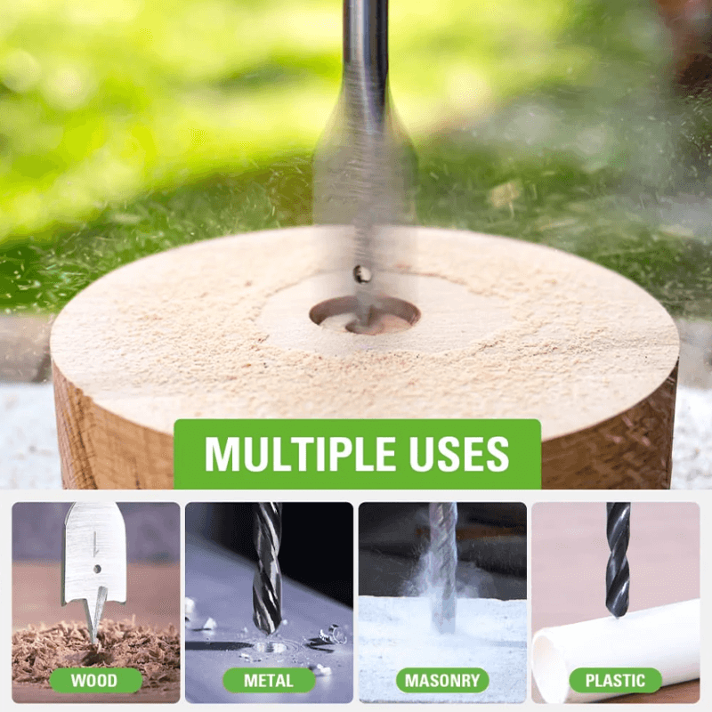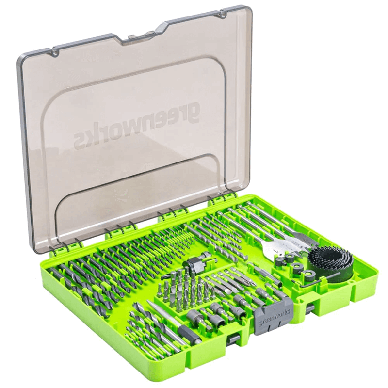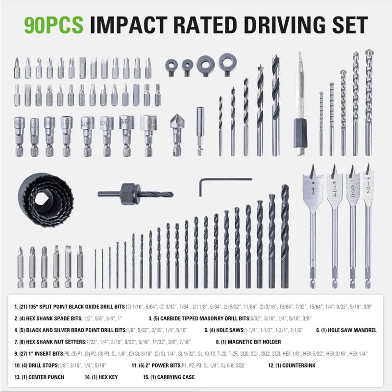 Inclus : Quatre-vingt-dix (90) forets multi-matériaux + ensemble d'entraînement, comprenant vingt et un (21) forets en oxyde noir à pointe fendue à 135°, quatre (4) forets à tige hexagonale, huit (8) porte-écrous à tige hexagonale, un (1) porte-embout magnétique, vingt-sept (27) embouts d'insertion de 1 po, quatre (4) butées de perçage, une (1) fraise, un (1) poinçon central, une (1) clé hexagonale, six (6) Forets électriques de 2 po, cinq (5) forets à maçonnerie à pointe en carbure, cinq (5) forets à pointe brad noire et argentée, quatre (4) scies-cloches, un (1) mandrin de scie-cloche, un (1) étui de transport .
