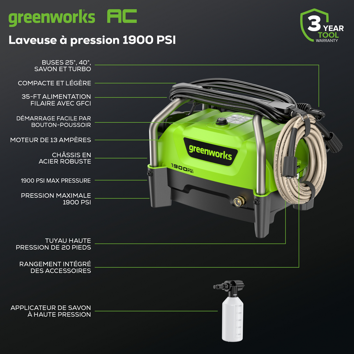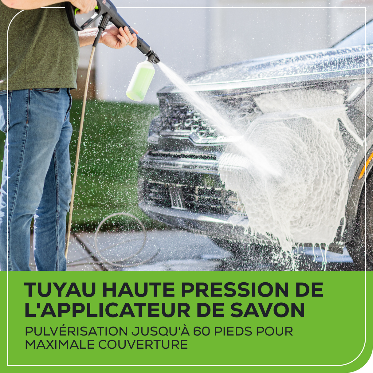- [SAVON] : Vaporisez votre voiture ou nettoyez les surfaces extérieures de votre maison avec l'accessoire pour bouteille de savon inclus.