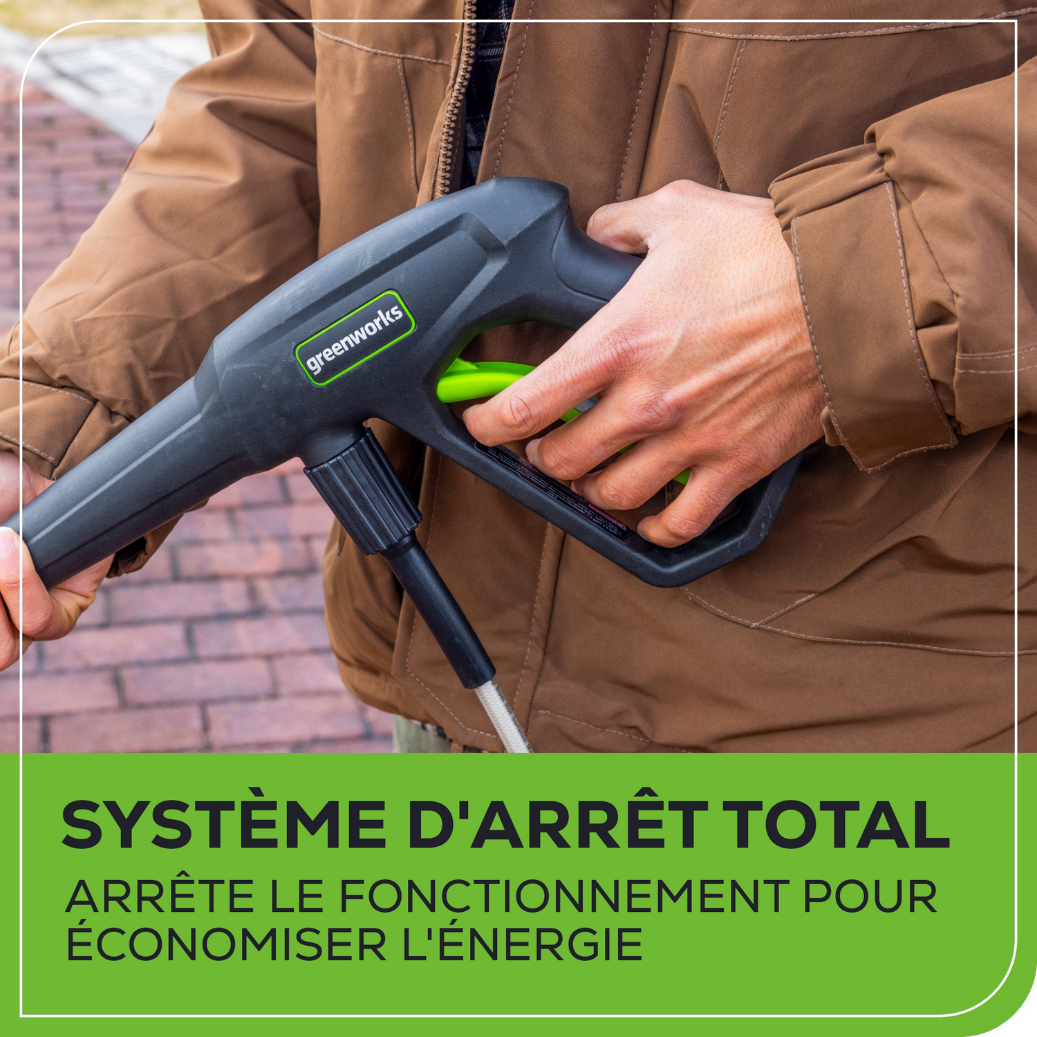 - [13 A] : Puissant moteur de 13 A et démarrage par bouton-poussoir. Le moteur s'arrête automatiquement lorsque la lance de pulvérisation n'est pas enclenchée, ce qui permet d'économiser de l'énergie et de prolonger la durée de vie de la pompe et du moteur.