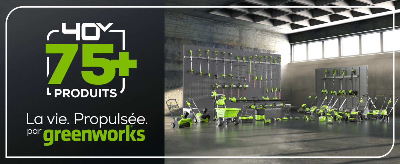 Bienvenue à La Vie. Propulsée. Par Greenworks. Donnez un coup de pouce au trottoir et passez au vert sans fumées, sans mélange, sans entretien et sans cordons de traction. La plate-forme lithium-ion Greenworks 40 V alimente plus de 60 produits, notamment des tondeuses, des souffleurs, des coupe-herbes, des scies à chaîne, des taille-haies et bien plus encore ! Offre la puissance dont vous avez besoin avec des performances sans décoloration et sans perte de mémoire après la charge. Laissez Greenworks vous aider à simplifier les travaux de jardinage. Tondez votre pelouse facilement grâce à la tondeuse autotracée Greenworks 40 V 20 po, batterie 5,0 Ah et chargeur inclus. Cette tondeuse sans fil fonctionnant sur batterie comprend un carter en acier, 7 hauteurs de coupe, la technologie innovante SmartCut et un démarrage par bouton-poussoir. et poignées pliantes pour un rangement compact. Construit pour durer; La plateforme Greenworks 40 V est accompagnée d'une garantie de 3 ans sur les outils et la batterie pour protéger votre investissement.