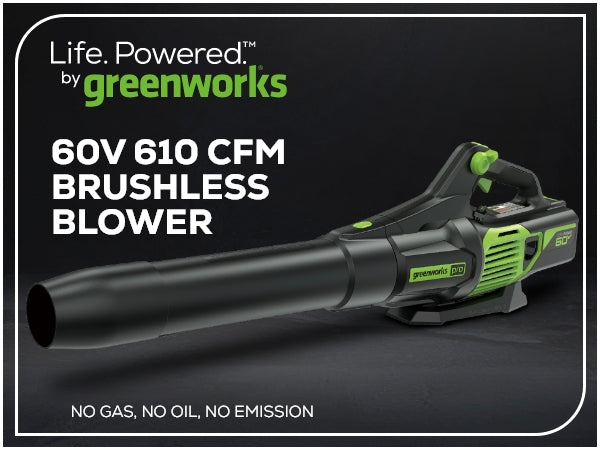 Alimenté par une batterie lithium-ion de 60 V de qualité professionnelle (vendue séparément), ce souffleur de feuilles axial sans fil Greenworks Pro 60 V offre plus de puissance et de performance que les souffleurs à essence classiques, sans le bruit, les fumées ou les émissions nocives. Avec une force de soufflage incroyable de 130 MPH de vitesse d'air maximale et un volume d'air maximal de 610 CFM (pi³/min), il surpasse facilement un souffleur à essence de 28 cc de qualité professionnelle. Il est doté de notre technologie Jet Fan, avec le meilleur rapport puissance/poids de l'industrie, et est équipé d'un bouton turbo, d'un contrôle de vitesse variable activé par la gâchette et d'un régulateur de vitesse. Ce souffleur compact et léger démarre en appuyant sur une gâchette, sans cordon de traction aggravant. De plus, vous n'avez pas à vous soucier de renverser, de mélanger ou de stocker de l'huile et du carburant. La puissante plateforme de batterie sans fil Greenworks Pro 60 V vous offre toute la puissance dont vous avez besoin pour affronter tous vos projets d'entretien de pelouse. Donnez un coup de pouce au trottoir ce printemps et passez au vert sans fumées, sans mélange, sans entretien et sans cordons de traction. Laissez Greenworks vous aider à simplifier les travaux de jardinage.