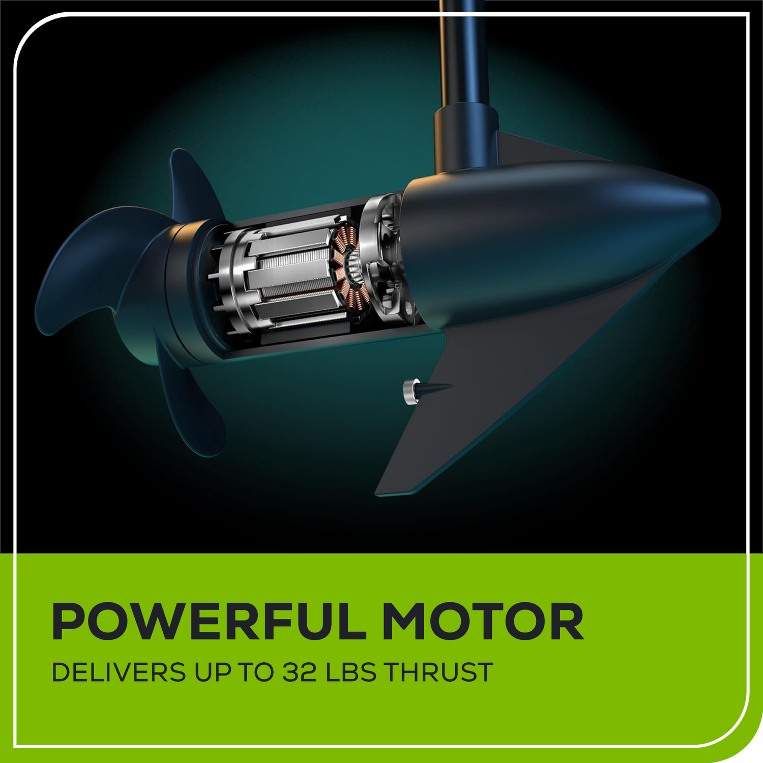 • POWER Crafted for small to medium-sized boats, this trolling motor boasts an impressive 32 lbs. of thrust. Equipped with a durable 36-inch composite shaft, designed to withstand the rigors of outdoor adventures while providing reliable performance on the water.