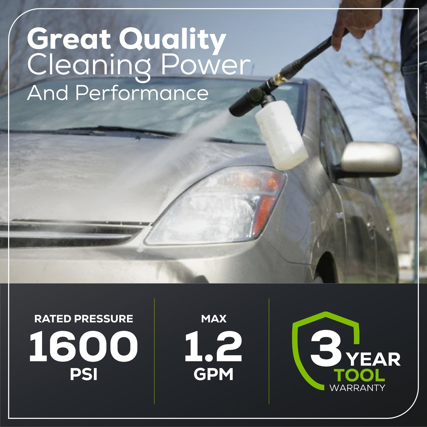 • POWER This 1600 PSI electric pressure washer helps eliminate dirt and grime with up to 1.2 GPM of exceptional cleaning power. Ideal for light-duty applications like cleaning cars, decks, windows and more.