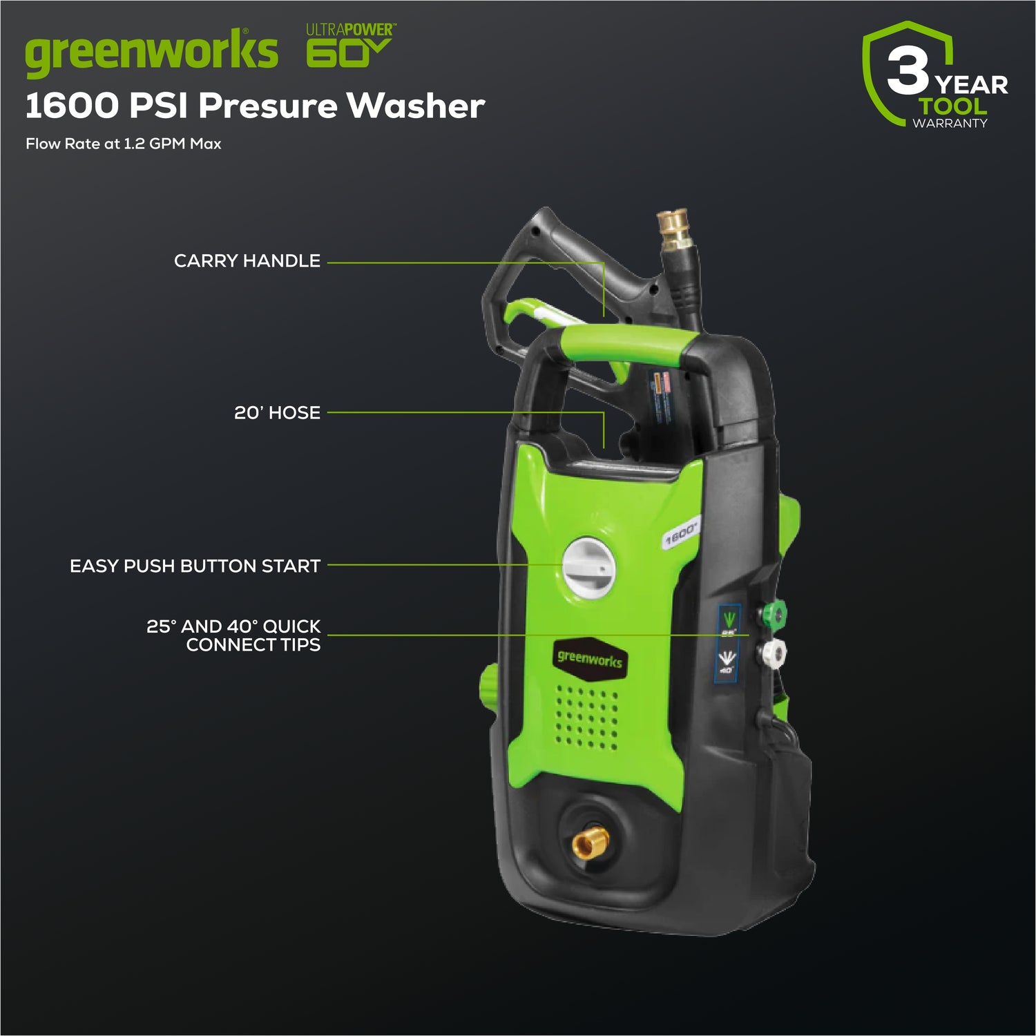 Welcome to a Life. Powered. by Greenworks. The world’s most powerful residential electric pressure washers! A fine addition to your tool collection, this electric power washer is ideal for everyday high-pressure cleaning jobs around the house. Whether it's the car, the house, the deck or the driveway, your stuff is sure to shine again. The Greenworks 1600 PSI 13 Amp 1.2 GPM Pressure Washer is sure to impress. Boasting up to 1.2 GPM of water flow, it's powerful, reliable and built for everyday cleaning. With a hassle-free push-button start, it powers up easily and gets to work fast. This unit includes a variety of quick connect tips and a soap attachment for a variety of cleaning applications. Backed by a 3-year tool warranty, it's built to last for years to come.