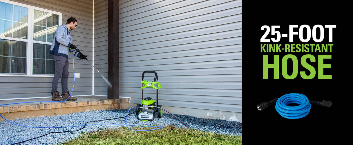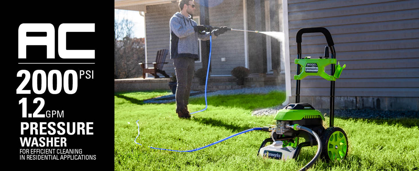 Welcome to a Life. Powered. by Greenworks. The world’s most powerful residential electric pressure washers! This electric power washer is ideal for everyday high-pressure cleaning jobs around the house. Whether it's the car, the house, the deck or the driveway, your stuff is sure to shine. The Greenworks 2000 PSI 1.2-Gallon-GPM Cold Water Electric Pressure Washer is sure to impress. Boasting up to 1.2 GPM of water flow, it's powerful, reliable and built for the toughest cleaning tasks. With a hassle-free push-button start, it powers up easily and gets to work fast. With a rugged metal spray gun, it's tough and durable, and the pump features an anodized coating that's resistant to corrosion. It's equipped with an extra-long 35-ft power cord with in-line GFCI and water-resistant power plug, hassle-free kink-resistant hose that eliminates frustrating hose tangles, never-flat wheels for easy transportation, substantial , and on-board accessory storage. Backed by a 3-year tool warranty, it's built to last for years to come.