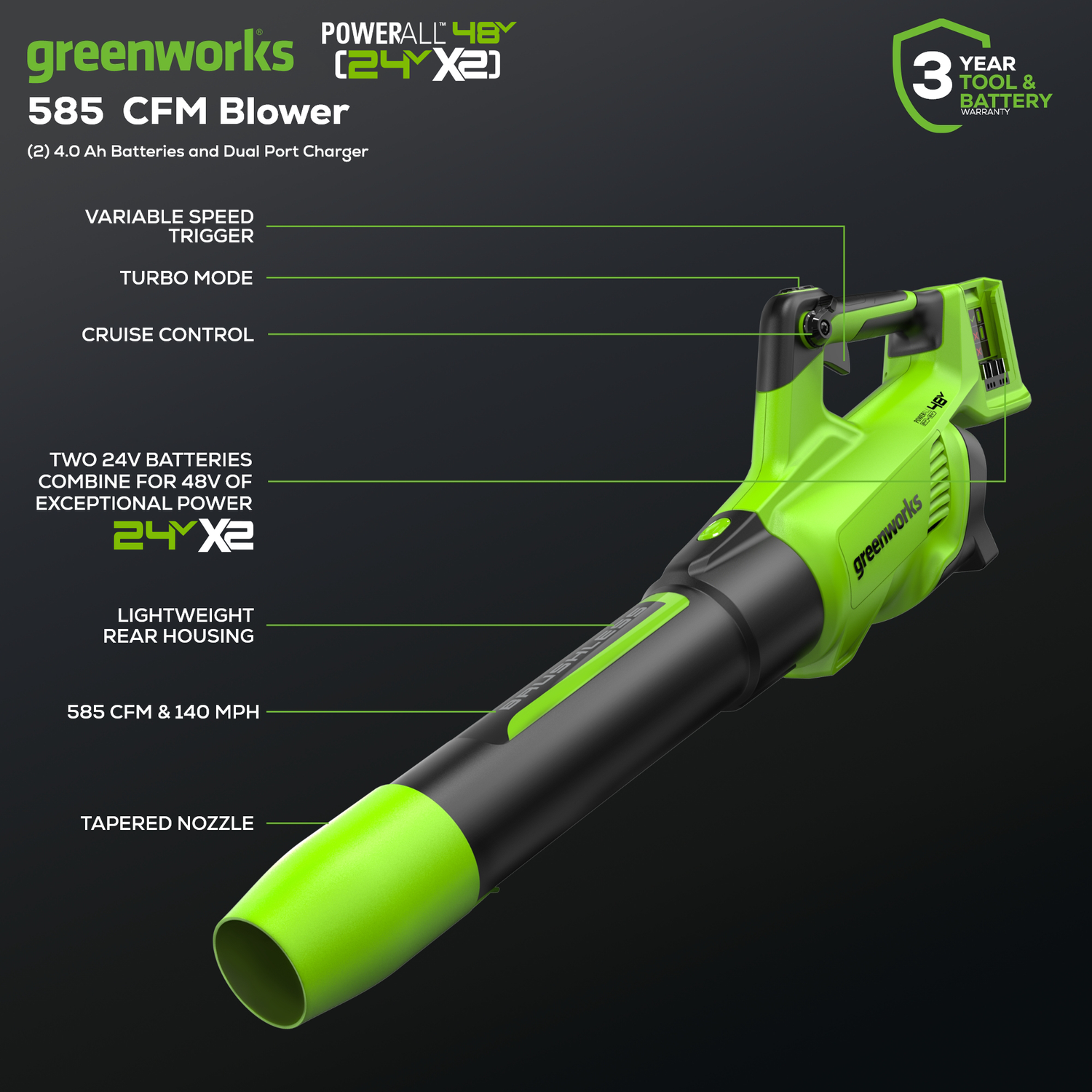 48V (24V x 2) Brushless Leaf Blower 140 MPH - 585 CFM, (2) 4.0Ah USB Batteries and Dual Port Charger Included, BL48L4410