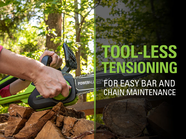 Chains should be tensioned before use. Check intermittently throughout each chore to make sure the chain is kept properly tensioned. A correctly tensioned chain should only pull away from the bar enough to fit a dime between the teeth and the bar. ***DO NOT TENSION A CHAIN AFTER YOU HAVE FINSHED USING THE TOOL. HOT METAL EXPANDS. IF THE CHAIN NEEDS TENSIONED WHEN HOT, THEN ALLOW TO COOL, THE CONTRACTING METAL COULD POTENTIALLY DAMAGE THE CHAIN, THE BAR AND EVEN THE UNIT. WAIT UNTIL THE NEXT USE (OR AT LEAST UNTIL COOLED) BEFORE TENSIONING***