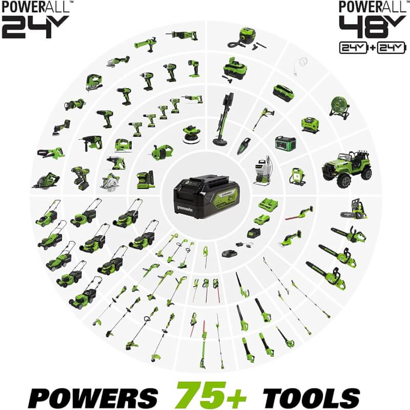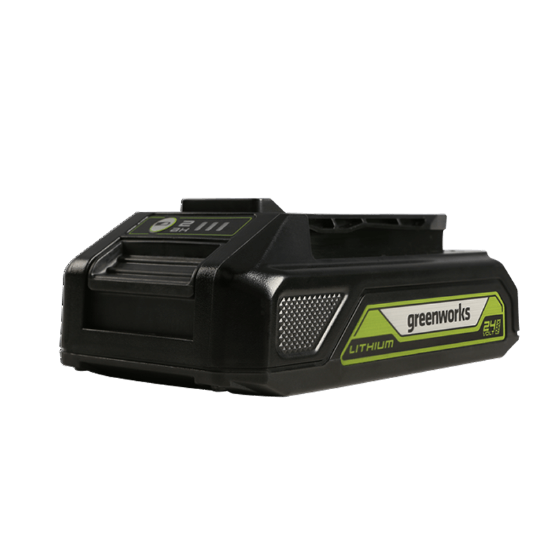 Ditch the hassles of gas in favor of an eco-friendly, hassle-free and powerful alternative. This 24V 2.0 AH Lithium-Ion battery features fade-free power, an onboard fuel indicator and is lightweight for easy use. The Greenworks 24V POWERALL™ lithium-ion platform powers over 75+ indoor & outdoor products, including lawn mowers, blowers, string trimmers, chainsaws, power tools and more! Our 24V lithium-ion battery provides 20% more power and 35% more run-time, and delivers fade-free power with no memory loss after charging. The Greenworks 24V POWERALL™ platform comes with a 3 Year Limited Tool & Battery Warranty to protect your investment.