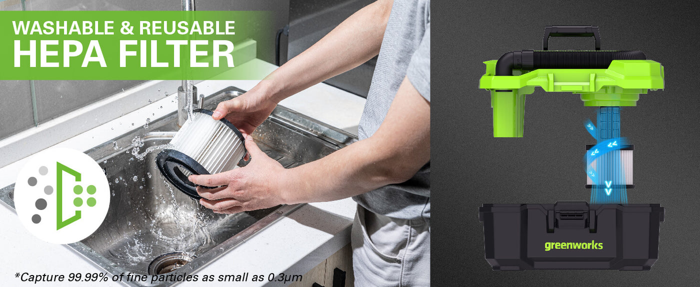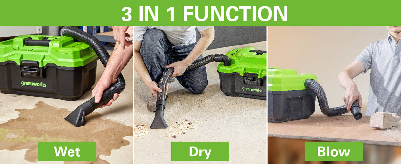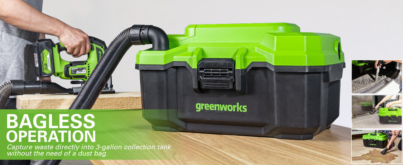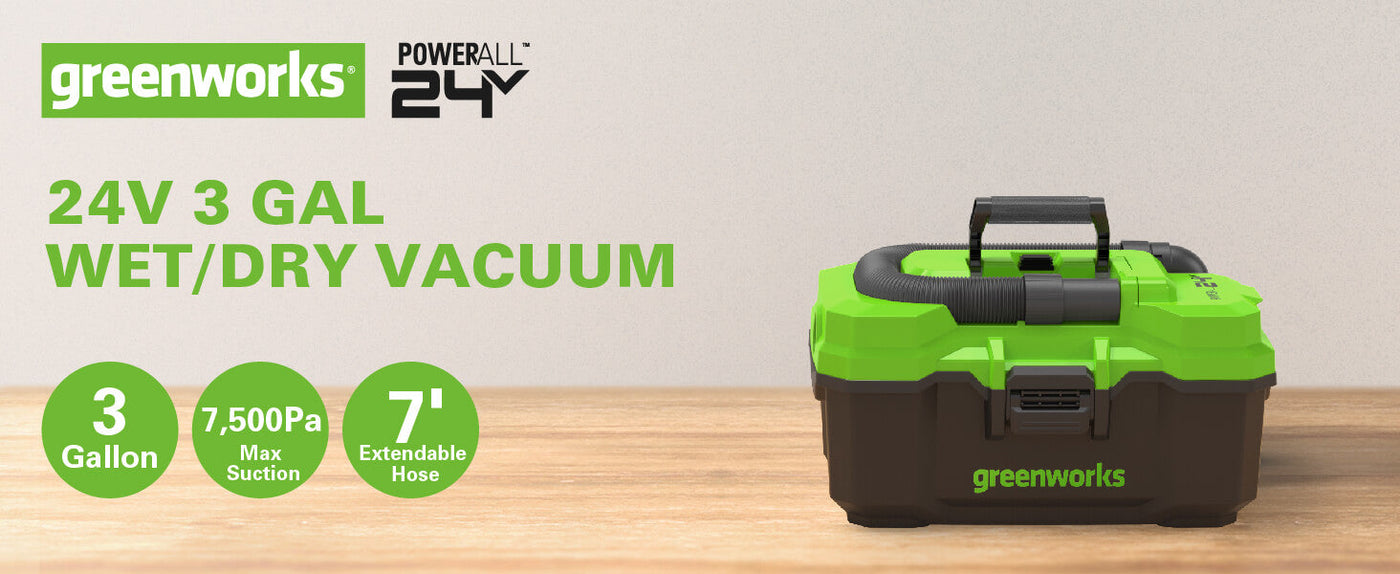 The Greenworks 24V 3-Gallon Wet/Dry Shop Vacuum is compact and portable while still providing plenty of power with 62 CFM of airflow and intense suction for both wet and dry applications. The vacuum quickly converts to a blower for light debris removal, and the washable HEPA filter traps 99.7% of dust. The Greenworks 24V lithium-ion platform powers over 25 outdoor products, including lawn mowers, blowers, string trimmers, chainsaws, hedge trimmers, and much more! The Greenworks 24V platform comes with a 3-year tool/battery warranty to protect your investment.