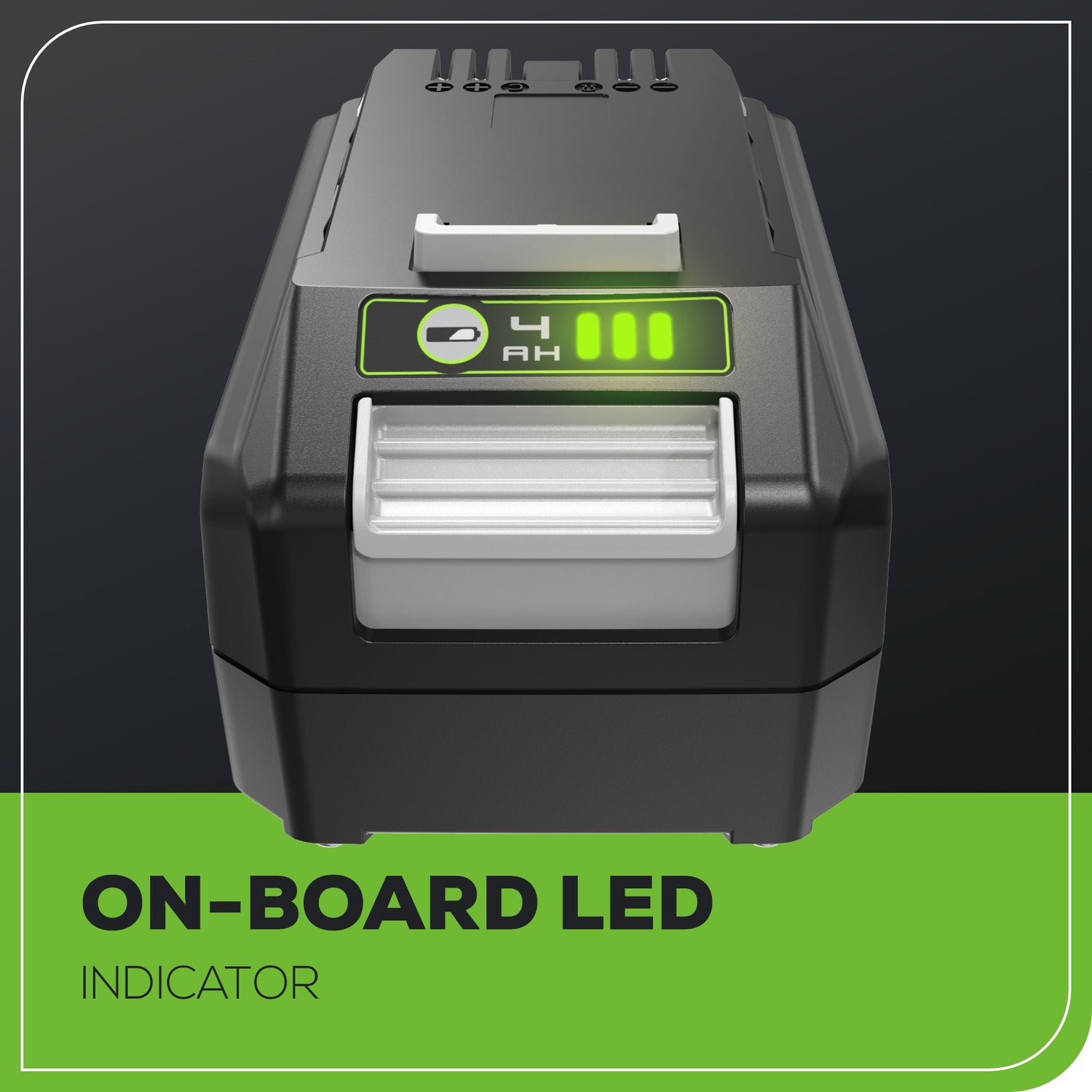 Ditch the hassles of gas in favor of an eco-friendly, hassle-free and powerful alternative. This 24V 4.0 Ah Lithium-Ion battery features fade-free power, an onboard fuel indicator and is lightweight for easy use. Greenworks 24V battery platform powers a family of over 75+ tools for both indoor and outdoor use. The Greenworks 24V POWERALL™ lithium-ion platform powers over 75+ indoor & outdoor products, including lawn mowers, blowers, string trimmers, chainsaws, power tools and more! Our 24V lithium-ion battery provides 20% more power and 35% more run-time, and delivers fade-free power with no memory loss after charging. The Greenworks 24V POWERALL™ platform comes with a 3 Year Limited Tool & Battery Warranty to protect your investment.