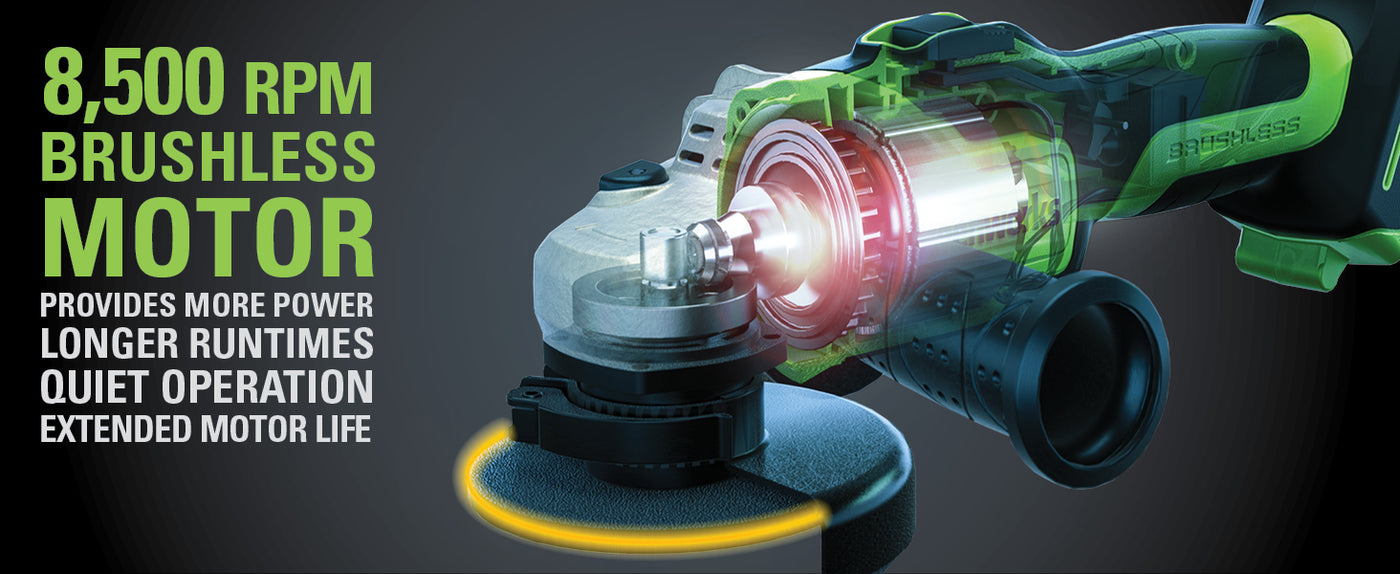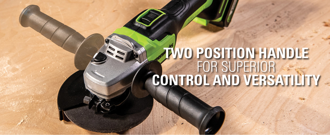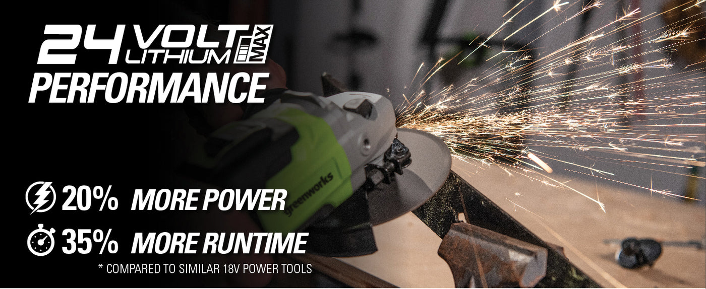 The Greenworks 24V POWERALL™ lithium-ion platform powers over 75+ indoor & outdoor products, including lawn mowers, blowers, string trimmers, chainsaws, power tools and more! Our 24V lithium-ion battery provides 20% more power and 35% more run-time, and delivers fade-free power with no memory loss after charging. This angle grinder features a high performance motor, aluminum gearbox for durability & superior cooling, spindle lock for quick & easy wheel changes and two position handle for superior control and versatility. The Greenworks 24V POWERALL™ platform comes with a 3 Year Limited Tool to protect your investment.