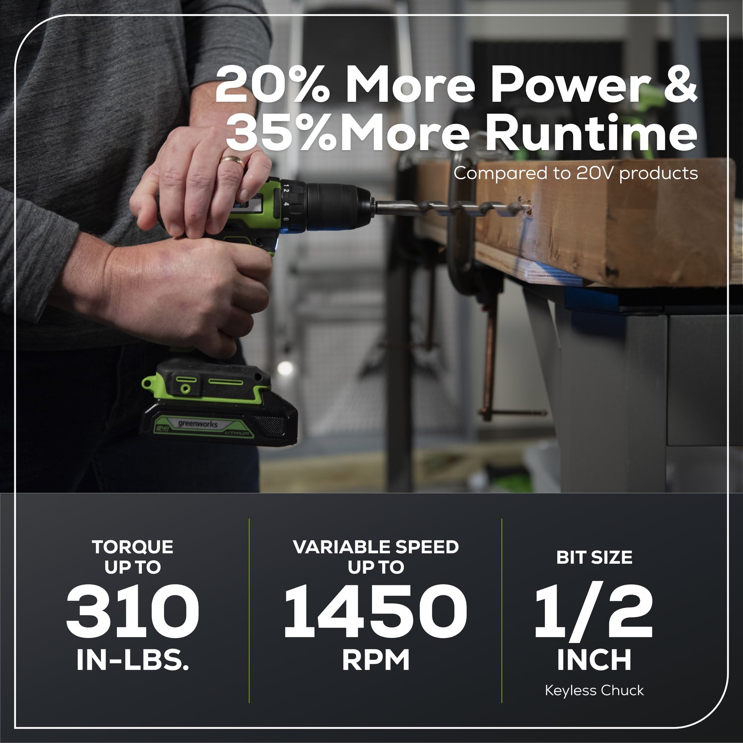 The Greenworks 24V POWERALL™ lithium-ion platform powers over 75+ indoor & outdoor products, including lawn mowers, blowers, string trimmers, chainsaws, power tools and more! Our 24V lithium-ion battery provides 20% more power and 35% more run-time, and delivers fade-free power with no memory loss after charging. The Greenworks 24V POWERALL™ platform comes with a 3 Year Limited Tool & Battery Warranty to protect your investment.
