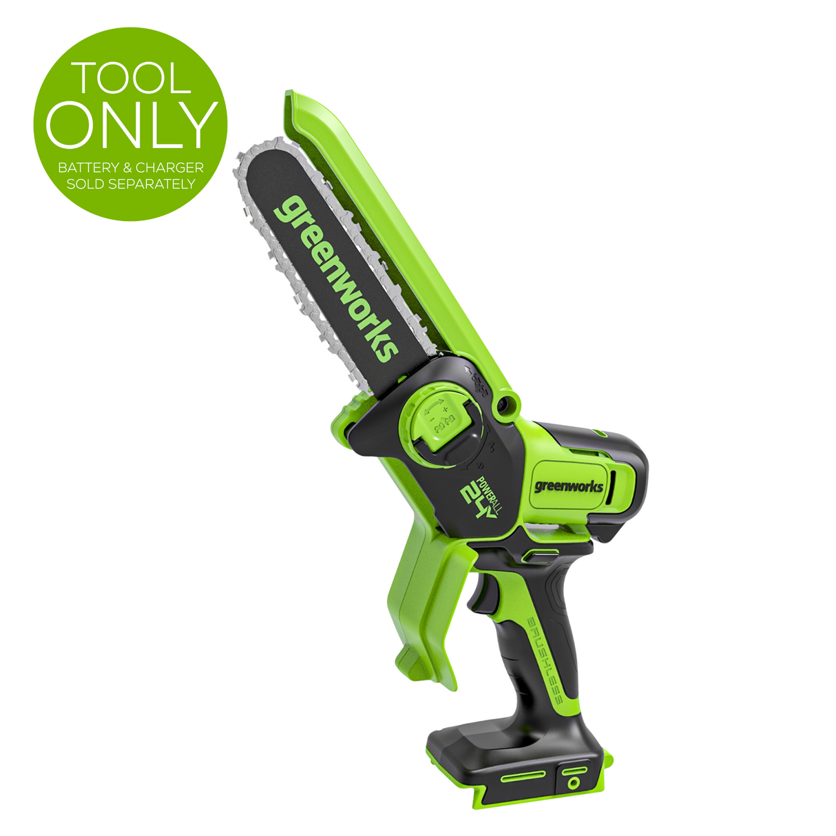 Welcome to a Life. Powered. by Greenworks. Powered by a Greenworks 24V POWERALL™ lithium-ion battery, this Greenworks cordless Pruner Saw is perfect for users of all experience, whether it is your first time or a veteran. This saw features our No Prime, No Choke, No Pull- easy-starting system for fast starts every time, with no aggravating pull cord. This lightweight cordless pruner saw is equipped with a 6-inch bar and chain and tool-less chain tensioning for easy bar and chain maintenance. Start with a tool kit, then add tool only equipment. This pruner saw is compatible with all Greenworks 24V battery models! The powerful Greenworks 24V cordless battery platform gives you all the power you need to tackle all your lawn care projects. Kick gas to the curb and go green with no fumes, no mixing, no maintenance and no pull cords. Let Greenworks help you take the work out of yard work. Backed by a 3-year warranty to ensure your investment is protected.