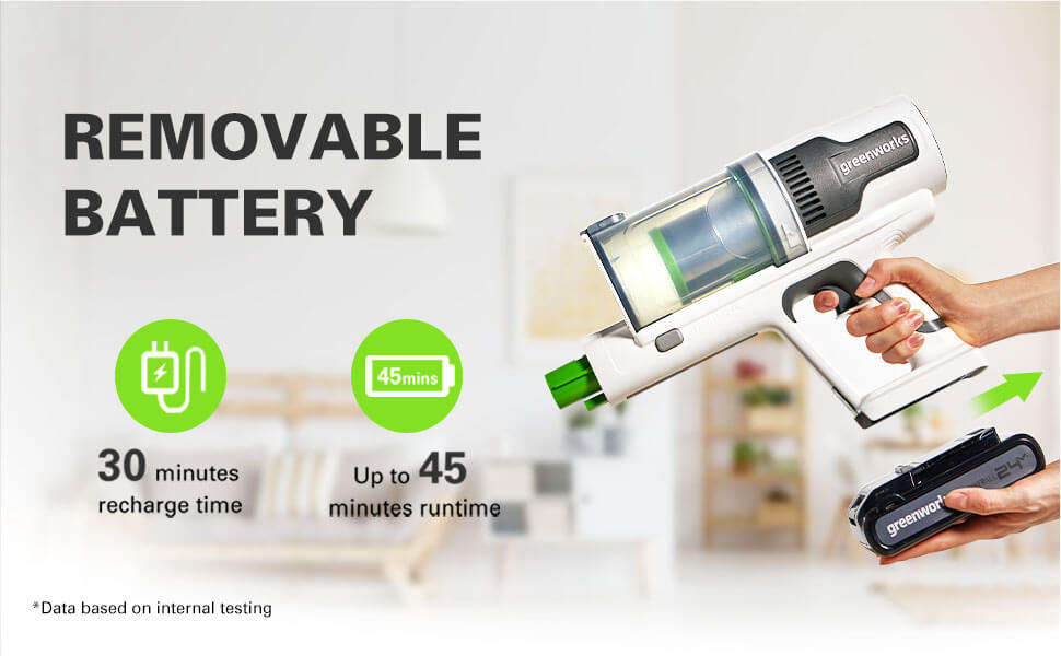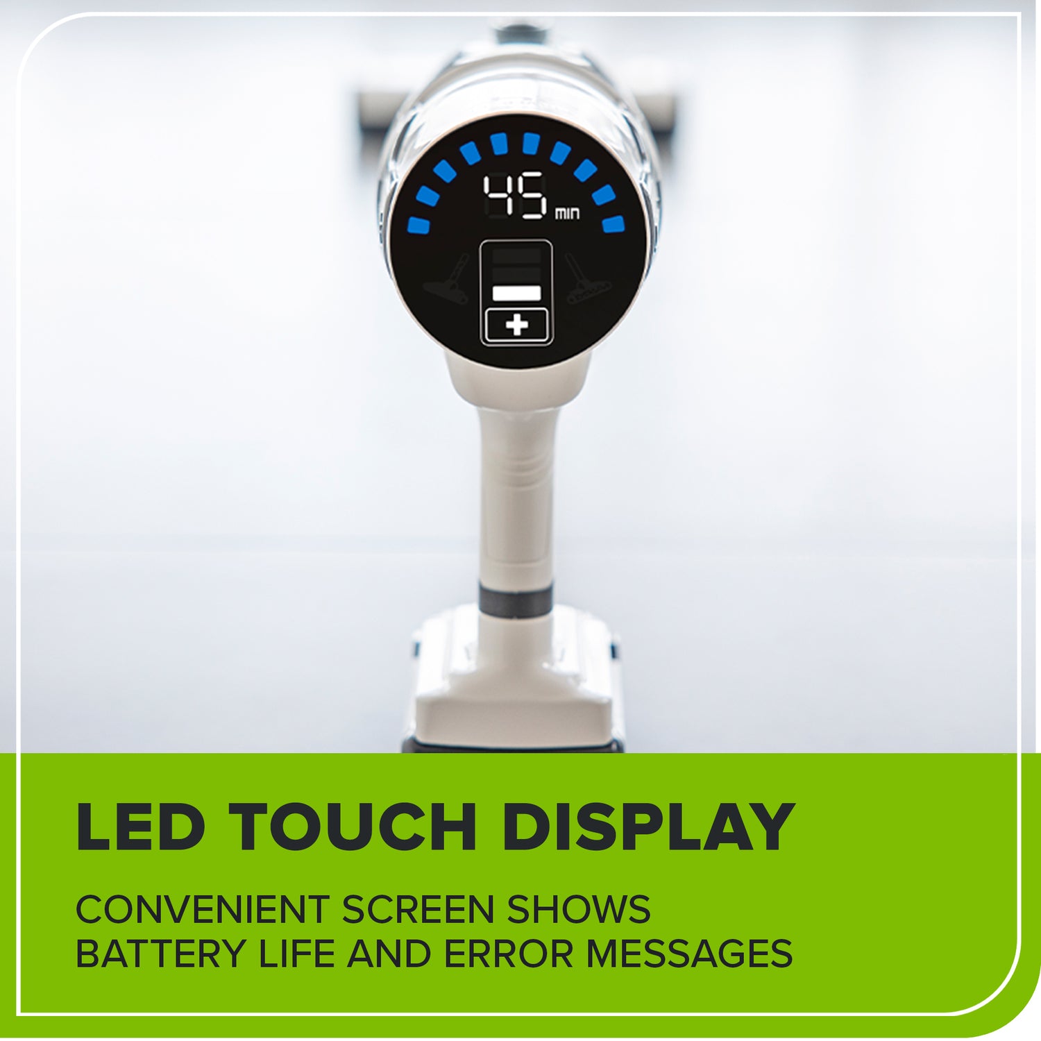 Welcome to a Life. Powered. by Greenworks. The 24V Brushless Cordless Stick Vacuum lets you enjoy the freedom of cordless cleaning without sacrificing powerful suction. Designed for convenience, it’s compact, lightweight, and easy to store, making vacuuming less of a chore. With an efficient brushless motor, you get stronger suction, quieter operation, and a longer motor life. Three adjustable power modes provide customizable performance, letting you control energy use for longer run times. The user-friendly LED touch display shows power mode, error messages, and remaining battery life for added convenience. Plus, the included 24V lithium-ion battery doubles as a portable power bank with a Type-C port, allowing you to charge devices like phones and tablets on the go.