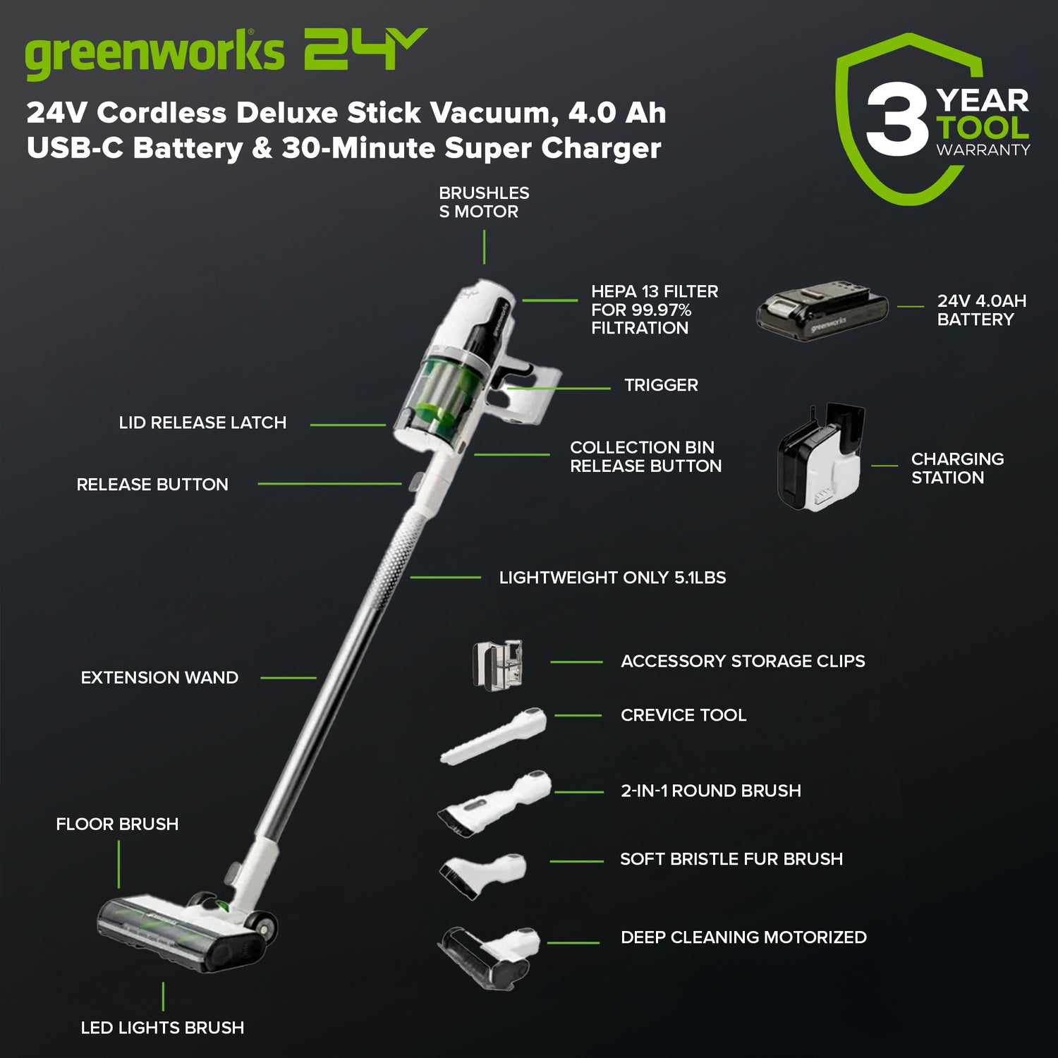 24V Cordless Deluxe Stick Vacuum, 4.0 Ah USB-C Battery & 30-Minute Super Charger