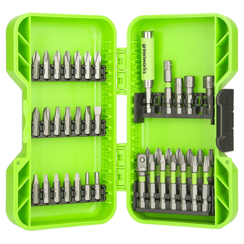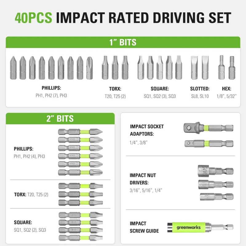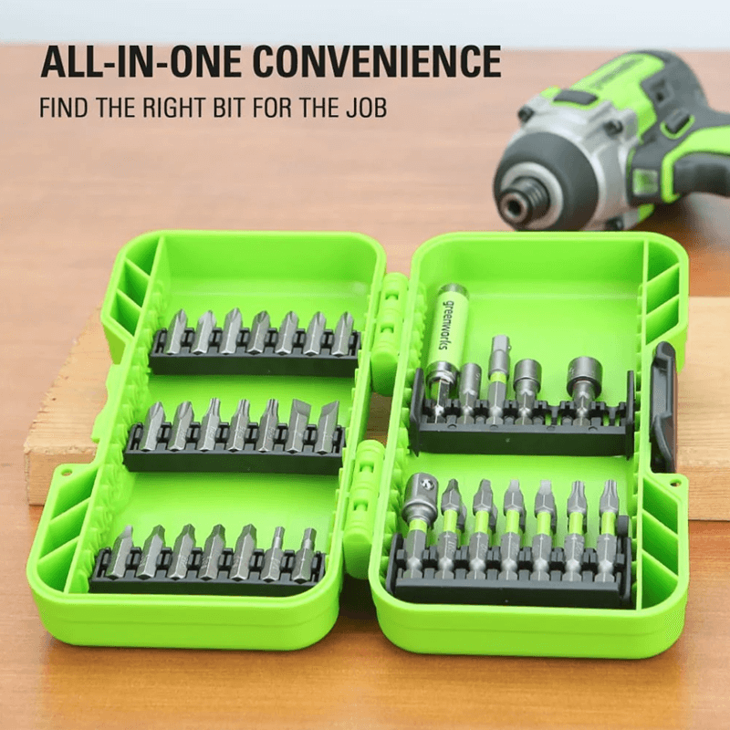 This bit set includes the most used sizes of bits needed for a wide range of tasks. It is compatible with most drills and drivers on the market. Ideal for most DIY projects, home maintenance, and repairs. This set includes a precision-milled bit tip for enhanced fitment with commonly used fasteners. The 2 in. bits feature a torsion zone that absorbs the high torque from more demanding applications and helps to preserve bit tips. It also provides flexibility and durability for extended bit life. Our set includes a magnetic bit holder and two impact socket adaptors for fast and easy switching between sizes, allowing you to pivot quickly between projects. Compatible with most brand drills, electric screwdrivers, and other power tools. Comprehensive, high quality 40 pcs bit set gives all-in-one convenience to users who want accessories conveniently available for everyday tasks. It is a must-have drill and driver bit set in your home garage. The bit set comes with a portable storage case with uncluttered layout for secure storage, easy access, organizing and portability. The green band on bits makes it easier to find on the jobsite and in your toolbox.