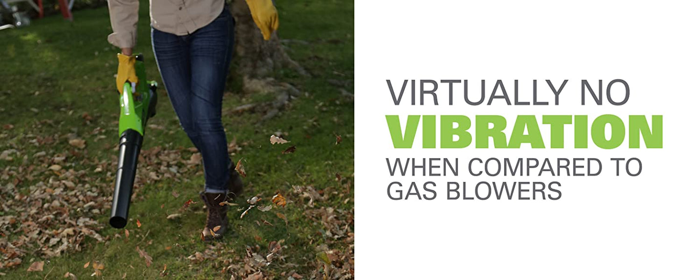 - [QUIET] 2X less noise and vibration than traditional gas blowers. At only 67 dB, you can work early in the morning or late in the evening without disturbing your neighbors.