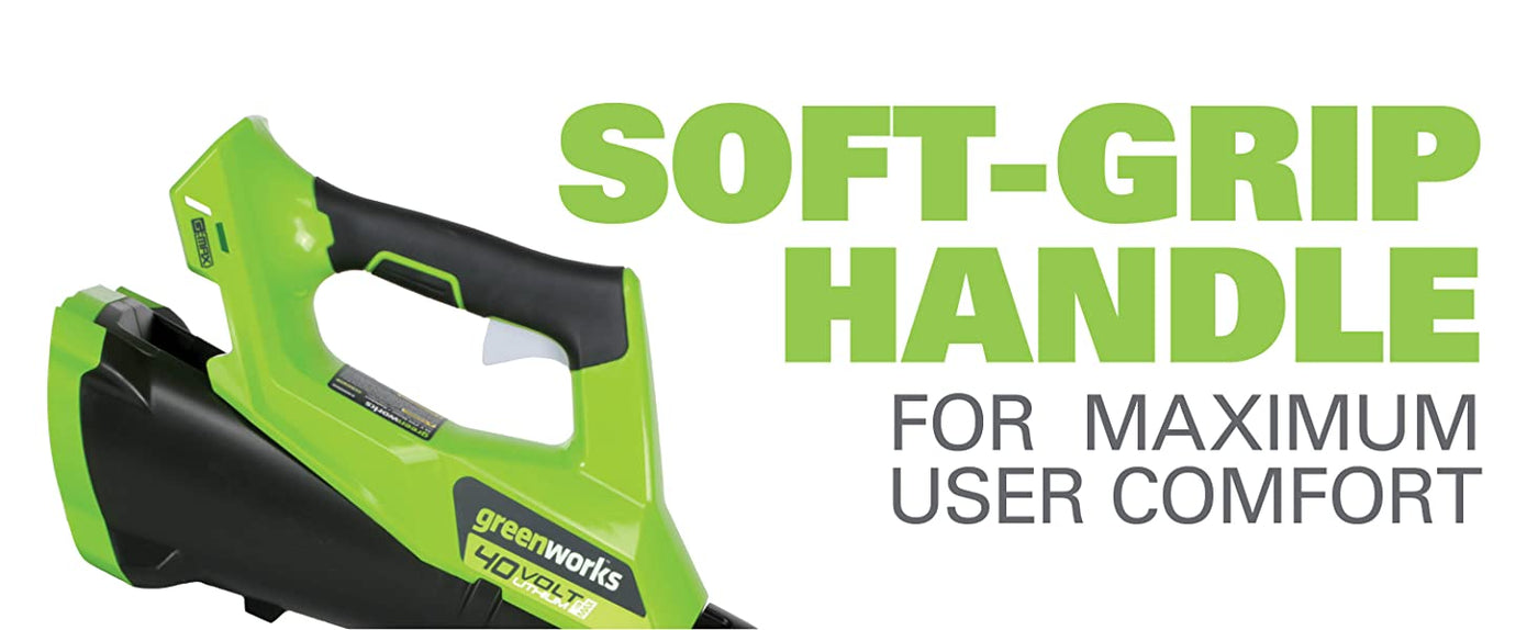 Welcome to a Life. Powered. By Greenworks. Cordless outdoor power tools are ideal for homeowners like you who are simplifying and focusing on what's essential to getting the most out of life. The Greenworks 40V lithium-ion platform powers over 75 outdoor products, including lawnmowers, blowers, string trimmers, chainsaws, hedge trimmers, and much more! The 40V lithium-ion battery provides the performance you need, with fade-free power with no memory loss after charging. Of high-quality manufacturing, these products are easy to start and lighter weight than the gas products you're used to, making your day of yard work a whole lot easier. This Greenworks 40V cordless handheld leaf blower provides powerful clearing performance featuring 450 CFM air flow and 125 MPH air speed. Featuring a comfort grip handle, variable speed trigger and cruise control - this blower is sure to impress. Backed by a 3-year warranty, this unit is built to last for years to come.