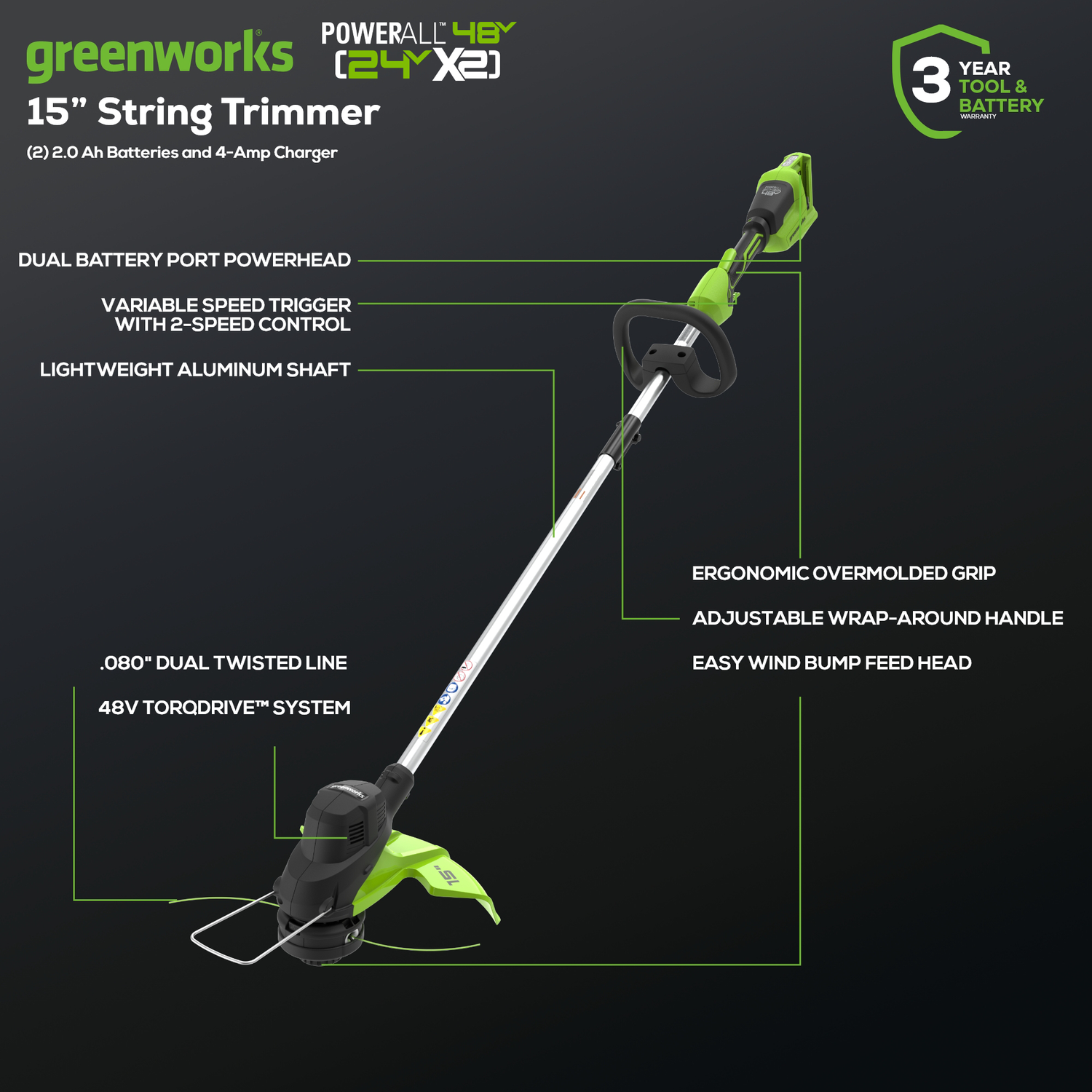 Welcome to a Life. Powered. by Greenworks. The Greenworks 24V POWERALL lithium-ion platform powers 125+ indoor & outdoor products, including lawn mowers, blowers, string trimmers, chainsaws, power tools and more! Our 24V lithium-ion battery provides 20% more power and 35% more run-time, and delivers fade-free power with no memory loss after charging. Go from zero to power with a push of a button and get you through the task at hand with less vibration, less noise and less mess. Take care of all your trimming in a flash with the Greenworks 48V (2 x 24V) 15-Inch TORQDRIVE Cordless String Trimmer, (2) 24V 2Ah USB Batteries and 4.0Ah Dual Port Charger Included. This cordless grass trimmer features a 15-inch cutting path, dual line Load n' Go trimmer head and variable speed trigger. The Greenworks 24V POWERALL platform comes with a 3 Year Limited Tool & Battery Warranty to protect your investment.