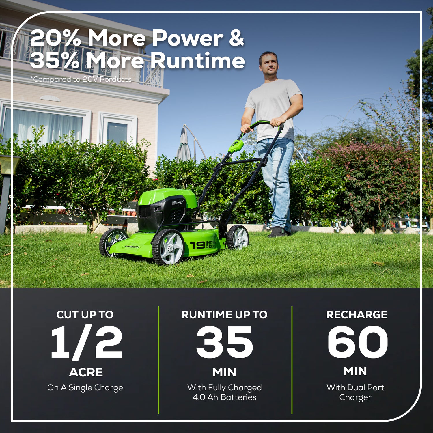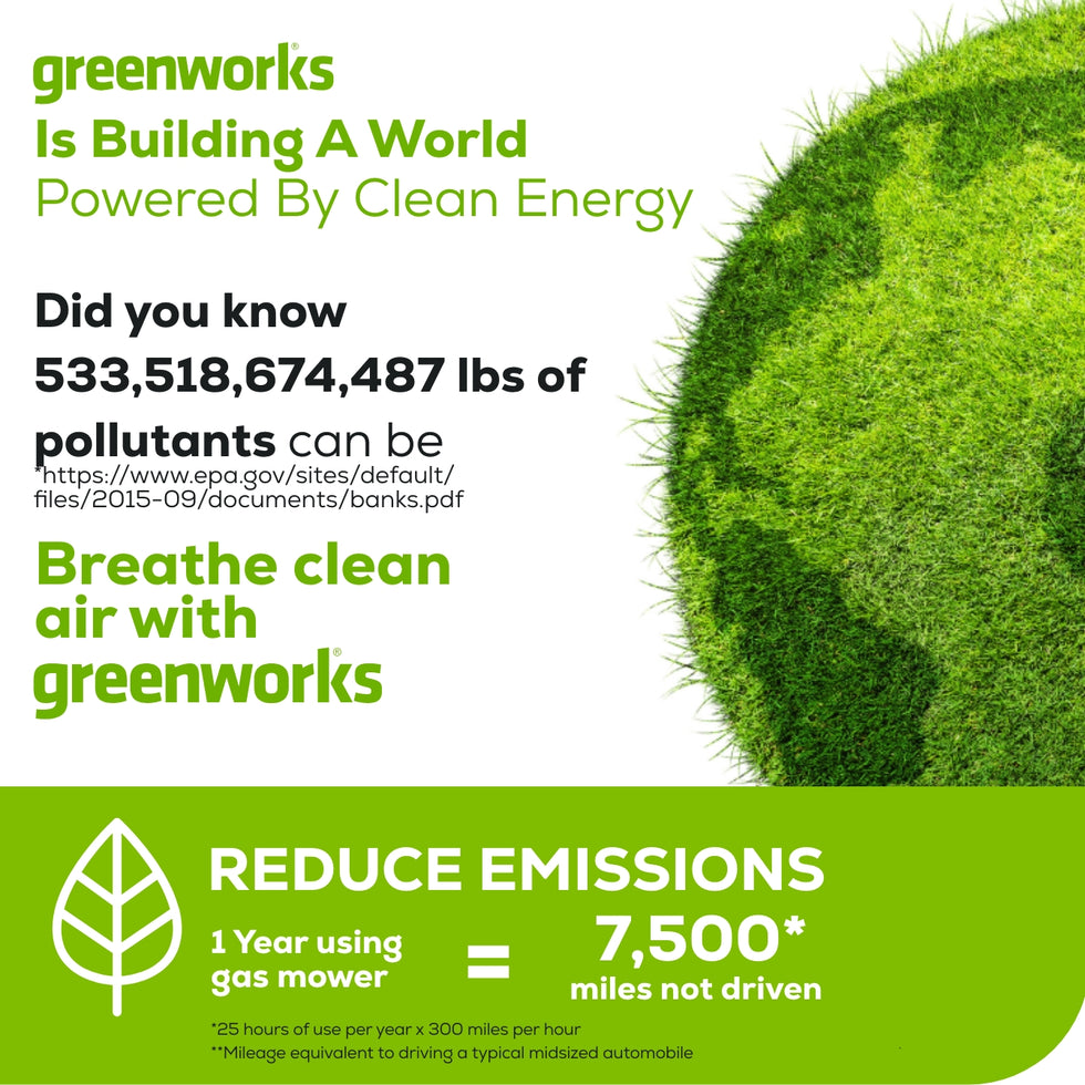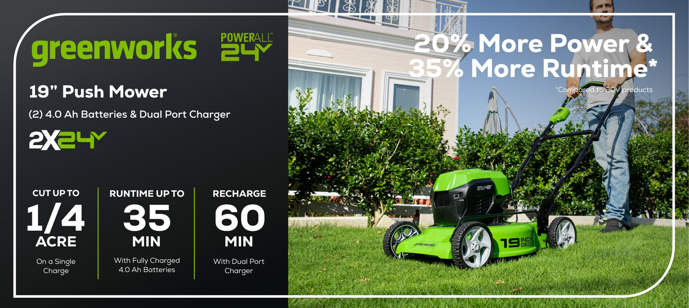 Welcome to a Life. Powered. by Greenworks. The Greenworks 24V PowerAll™ lithium-ion platform powers over 125+ indoor & outdoor 24V products, including lawnmowers, blowers, string trimmers, chainsaws, power tools and more! Our 24V batteries provide 20% more power and 35% more run-time, and deliver fade-free power with no memory loss after charging. Kick gas to the curb and go green with no fumes, no mixing, no maintenance, and no pull cords. Let Greenworks help you take the work out of yard work. Keep your lawn looking incredible with the Greenworks48V (2 x 24V) 19" Brushless Push Lawn Mower, (2) 24V 4.0Ah Batteries and Charger Included. This cordless battery operated lawnmower features a steel deck, 7 cutting heights, innovative SmartCut technology, push button start and folding handles for compact storage. When looking for tools and outdoor power equipment, we know you’re thinking about quality. That’s why Greenworks backs our 24V tools with a 3 Year Limited Tool & Battery Warranty.