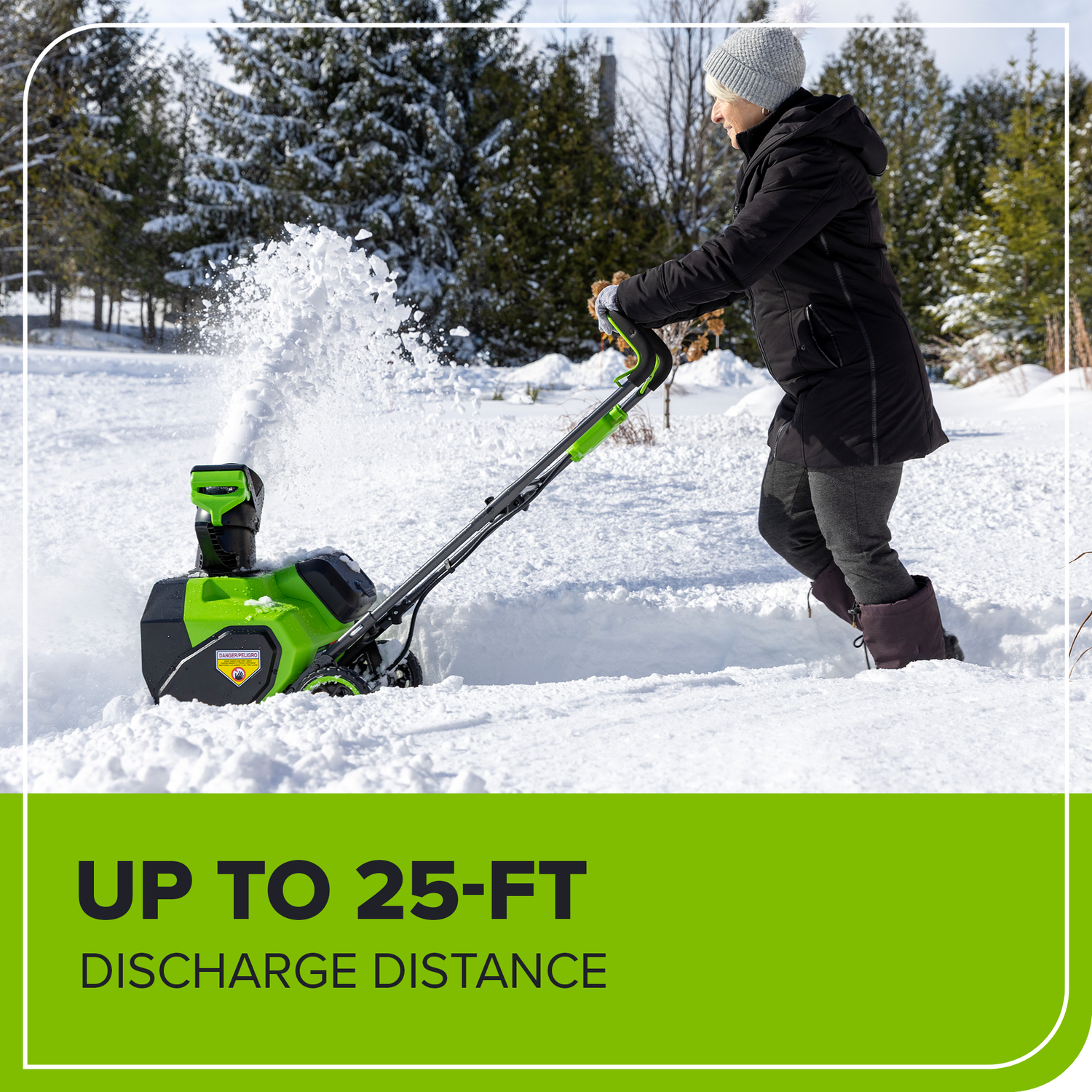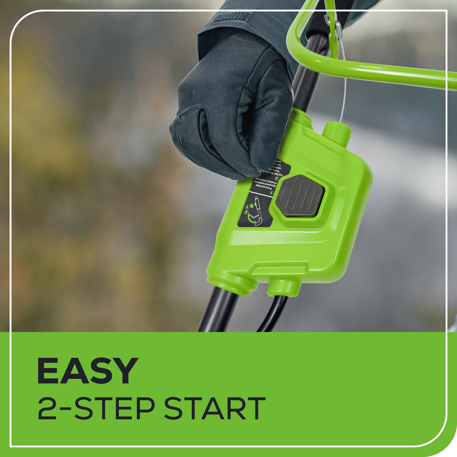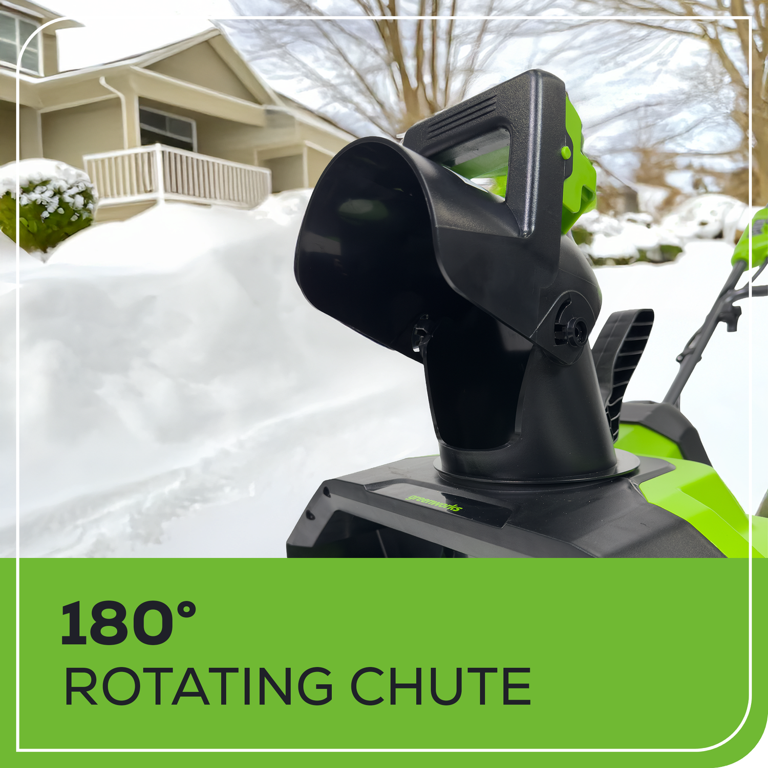 Welcome to a Life. Powered. By Greenworks. Take the hassle out of winter with the Greenworks 48V (24Vx2) 16" Snow Thrower, ideal for sidewalks, driveways, and patios. Includes 2×24V 4.0 Ah batteries and charger for full cordless convenience, clearing a 16" wide by 10" deep path with its single-speed poly rust-proof impeller. Compatible with all Greenworks 24V batteries—we recommend 4.0 Ah or higher for best results. Features 180° chute rotation throwing snow up to 25' and a folding handle for easy storage and transport. Spend less time shoveling and more time enjoying winter with the Greenworks 2X24V 16" Snow Thrower—backed by a 3-year tool & battery limited warranty.