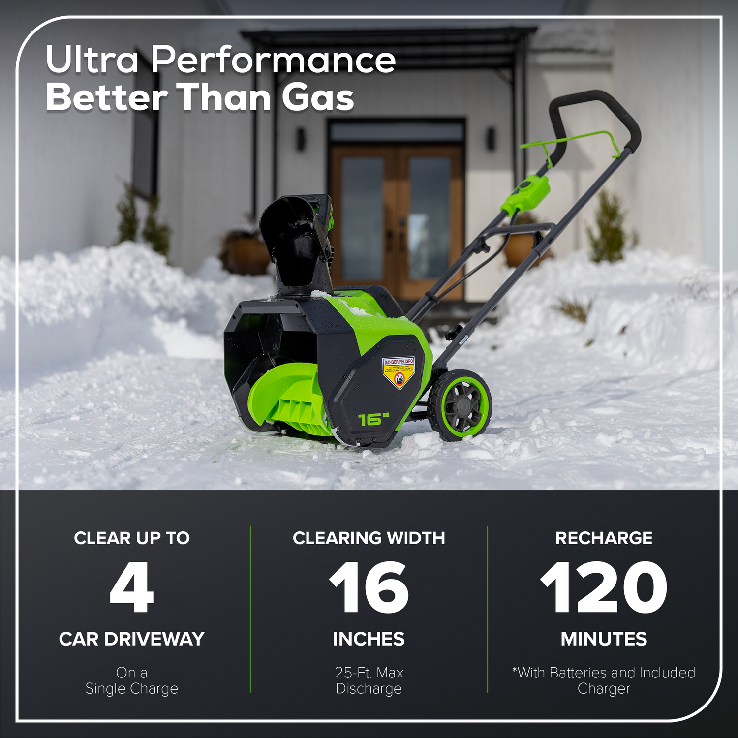 Our single-stage snow thrower kits are often supplied with enough battery capacity to cover the average 4-car driveway. It is important to note that the overall run time received is ultimately determined by the load acting against the unit and will fluctuate.