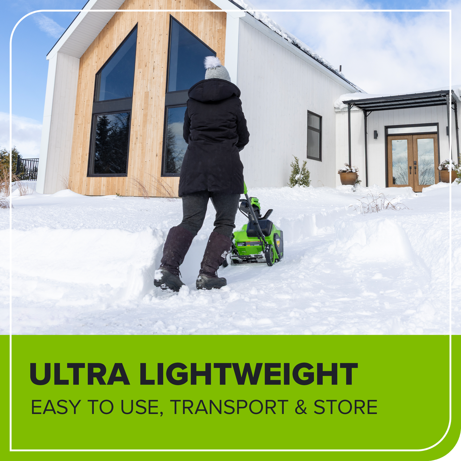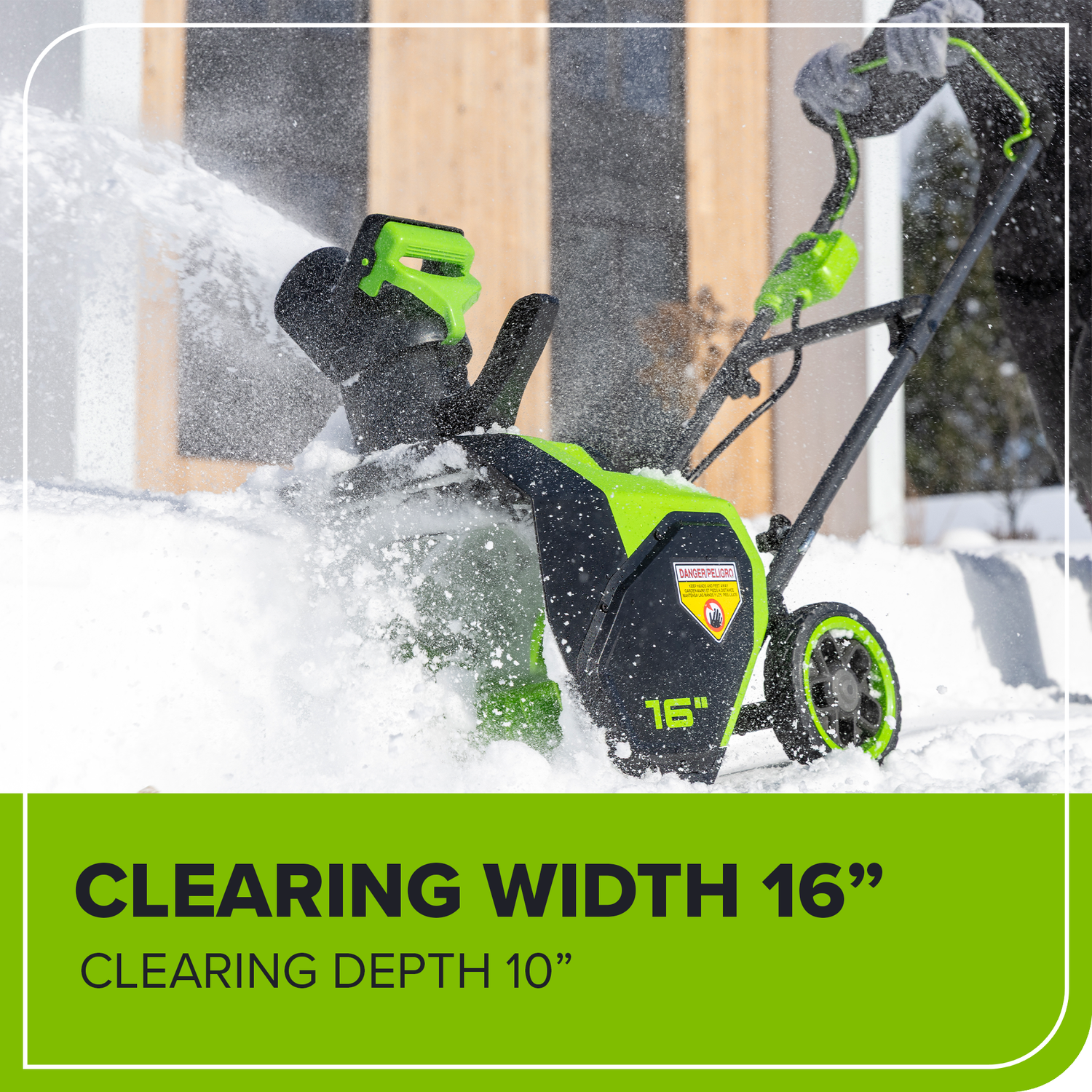 Welcome to a Life. Powered. By Greenworks. Take the hassle out of winter with the Greenworks 2X24V (48V) 16" Snow Thrower, perfect for clearing sidewalks, driveways, and patios. Runs on two 24V batteries (sold separately) for cordless convenience, and clears a 16" wide by 10" deep path with its single-speed poly rust-proof impeller. Compatible with all Greenworks 24V PowerAll™ batteries—for best results, use 4.0Ah or higher—it features a 180° chute rotation handle that throws snow up to 25'. The folding handle system allows for quick storage and transport. Spend less time shoveling and more time enjoying winter with the Greenworks 16" Snow Thrower—backed by a 3-year limited warranty.