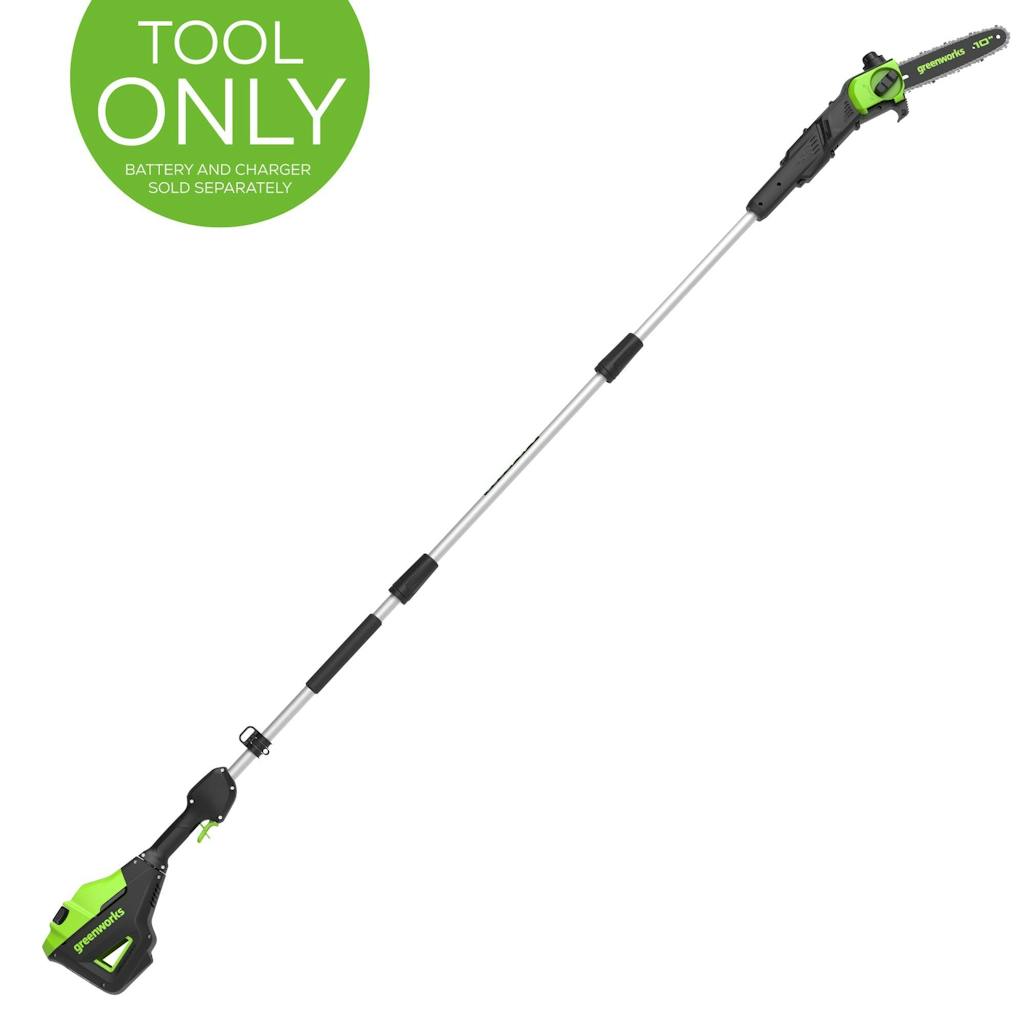 Our Greenworks 80V Cordless 10" Brushless Pole Saw is a safe and easy way to trim high branches & limbs without the use of a ladder. The brushless motor delivers more torque for a professional cutting experience. The Greenworks lineup features over 50 80V tools, allowing you to ditch your gas tools for an innovative, eco-friendly alternative.