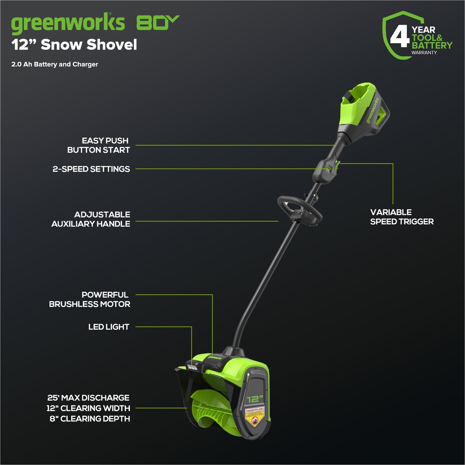 Welcome to a Life. Powered. By Greenworks. Make clearing sidewalks and driveways easier this winter with the Greenworks 80V 12" Brushless Snow Shovel. Built with a high-efficiency 2.5kW brushless motor and two-speed impeller providing speeds up to 2500 RPM, this snow shovel is sure to impress. Bright LED lights and quiet operation make it convenient for use early in the morning or late at night. Powered by an 80V lithium-ion battery, it features a clearing width of 12" and a clearing depth of 8”. Say goodbye to gas this winter and hello to Greenworks. This snow shovel is compatible with the complete Greenworks 80V system of tools and batteries. Backed by a 4-year warranty, this snow shovel is built to last for years to come.