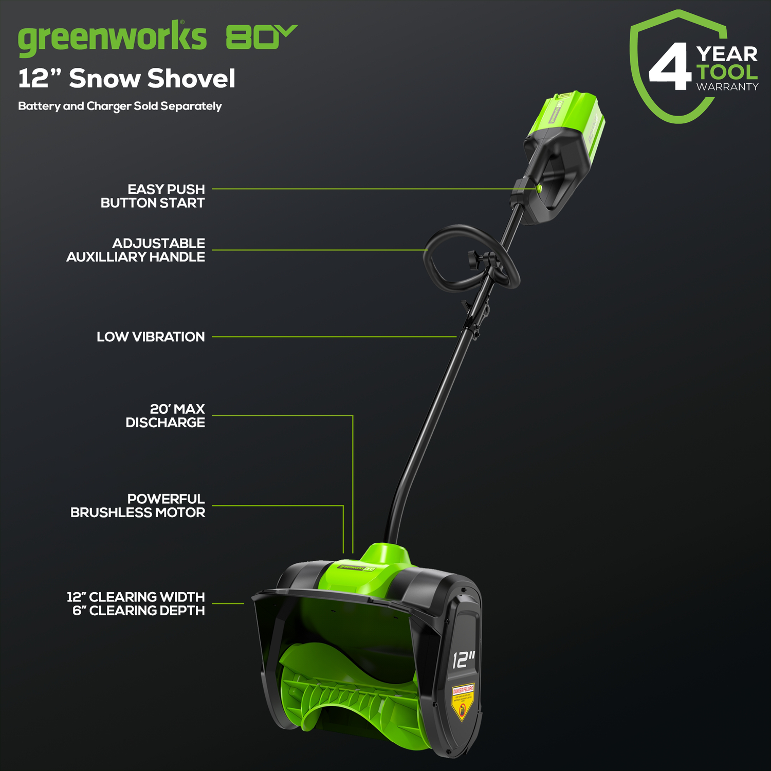 Welcome to a Life. Powered. By Greenworks. Make clearing sidewalks and driveways easier this winter with the Greenworks 80V 12" Brushless Snow Shovel. Built with a high-efficiency 1.2kW brushless motor providing speeds up to 1800 RPM, this snow shovel is sure to impress. Quiet operation make it convenient for use early in the morning or late at night. Powered by an 80V lithium-ion battery, it features a clearing width of 12" and a clearing depth of 6”. Say goodbye to gas this winter and hello to Greenworks. This snow shovel is compatible with the complete Greenworks 80V system of tools and batteries. Backed by a 4-year warranty, this snow shovel is built to last for years to come.