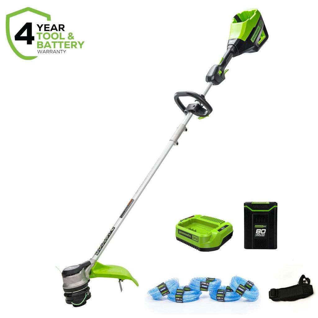 Welcome to a Life. Powered. by Greenworks. Landscaping has never been easier with the Greenworks Pro 80V System; the most powerful cordless battery platform in outdoor power equipment. You can now breeze through your yard work with this premium grass trimmer that delivers zero gas, zero emission and zero maintenance. Go from zero to power with a push of a button and get through the task at hand with less vibration, less noise and less mess. Get all your trimming done in no time with the Greenworks 80V 14"/16" Brushless Grass Trimmer, complete with Strap, 4.0Ah Battery and Charger Included plus 5 Rolls of Line. This powerful cordless grass trimmer features a variable 14"/16" cutting path, high-efficiency brushless motor for maximum runtime, and a Load n' Go trimmer head for hassle-free line reloading. Perfect for heavy-duty yard work, this professional-grade string trimmer tackles thick weeds and overgrown grass with ease. Plus, all Greenworks Pro 80V grass trimmers include a 4 Year Limited Tool & Battery Warranty to ensure your investment is protected.
