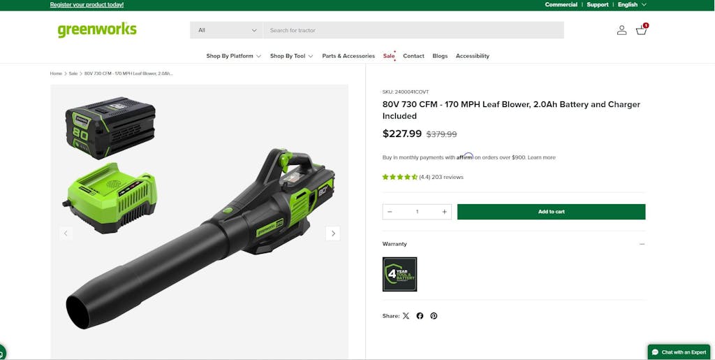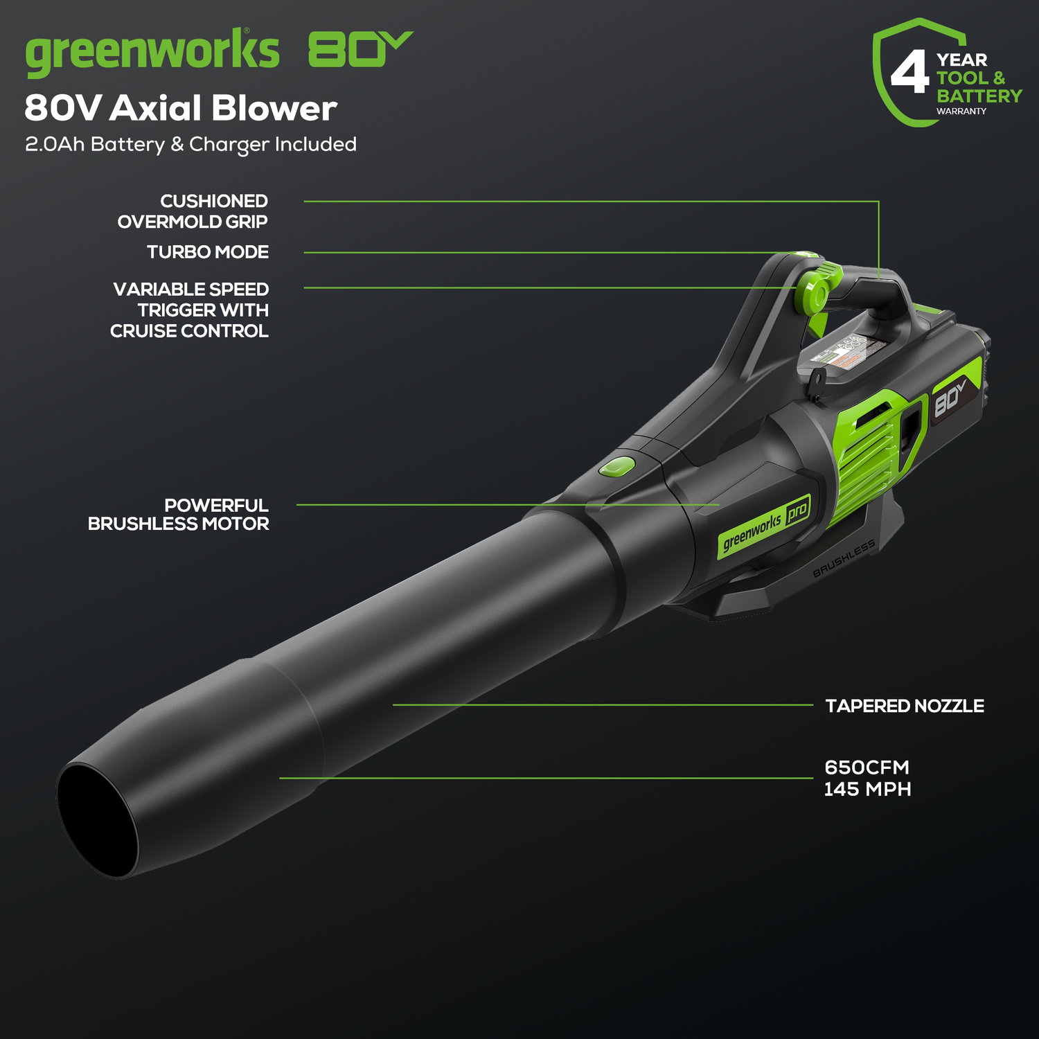 Welcome to a Life. Powered. By Greenworks. Powered by a pro-grade 80V 2.0Ah 144Wh lithium-ion battery, this Greenworks PRO 80V 170MPH / 730CFM Cordless Axial Blower delivers power and performance better than a typical gas-powered blower, without the extra noise, fumes, or harmful emissions. This handheld brushless axial blower is capable of high-velocity air speeds up to 170 MPH and airflow up to 730 CFM using a 4.0Ah battery or higher, or up to 155 MPH and airflow up to 650 CFM using a 2.0Ah or 2.5Ah battery. This versatile blower easily handles the toughest blowing tasks like clearing wet & heavy leaves, grass, and other stubborn debris. The Greenworks lineup features 75+ high-performance Pro 80V tools, allowing you to ditch your gas tools for an innovative, eco-friendly alternative. Start with a tool kit, then add tool-only equipment. This leaf blower can be used with all Greenworks 80V battery models! Let Greenworks help you take the work out of yard work. Backed by a 4-year tool, battery & charger warranty, you can ensure that your investment is protected.