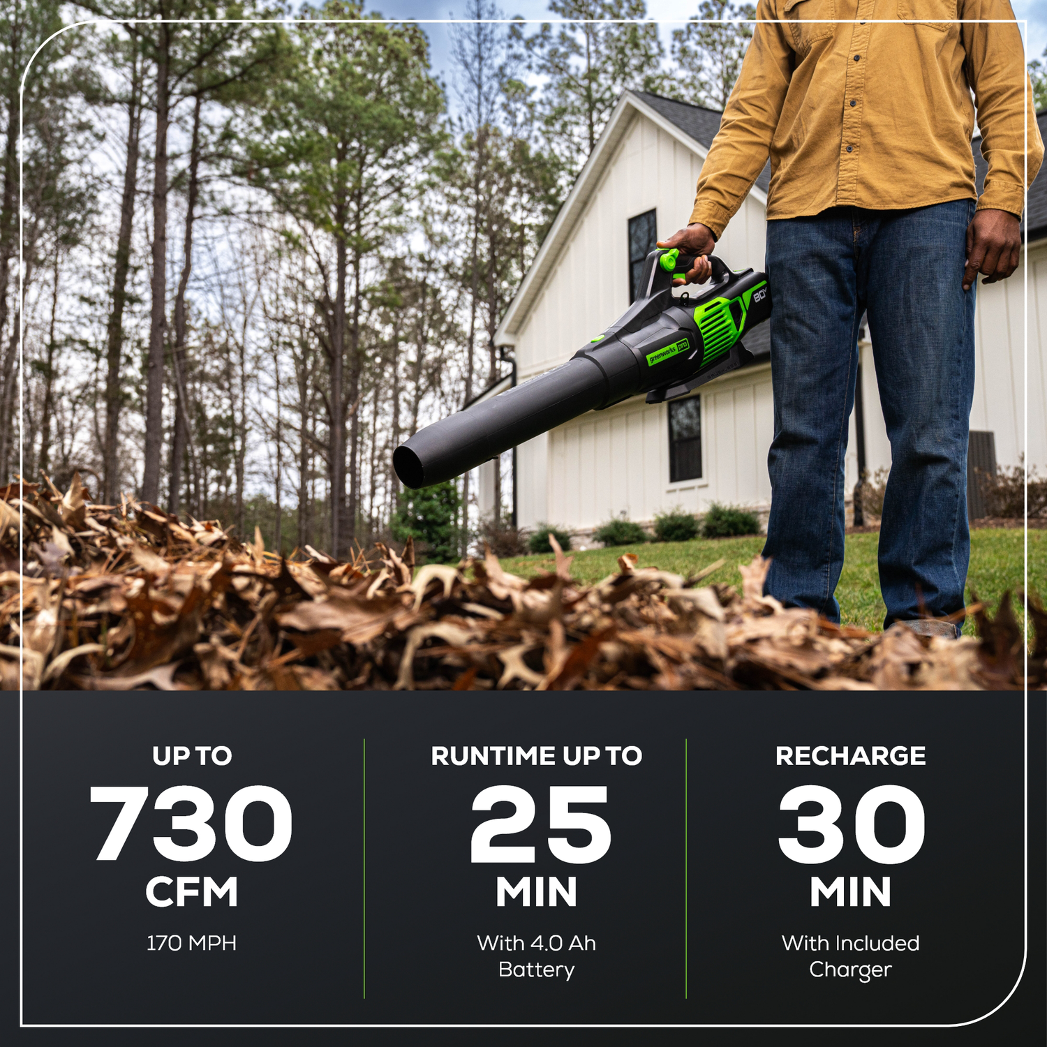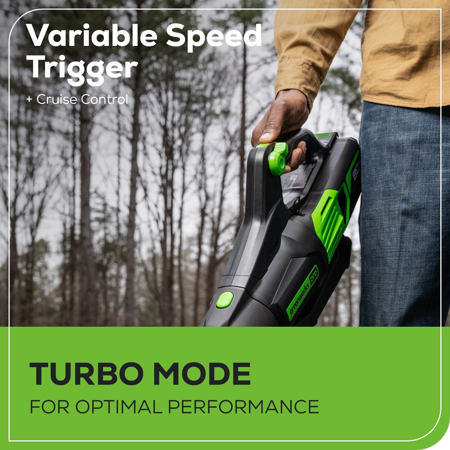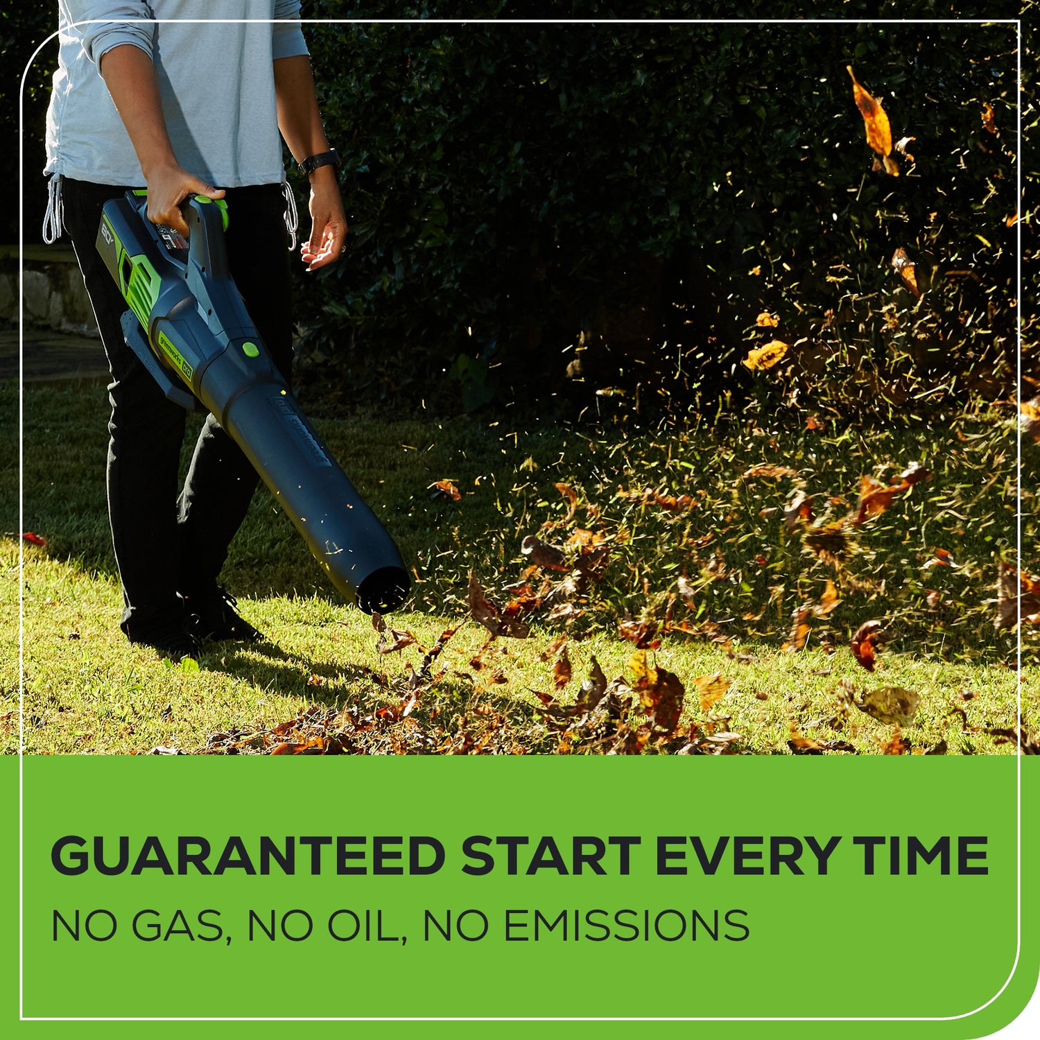 Powered by a pro-grade 80V lithium-ion battery, the new Greenworks battery-powered blower delivers power and performance typical of gas-powered blowers, without noise, fumes, or harmful emissions. With the incredible blowing force of up to 170 MPH max air speed and 730 CFM max air volume when using a 4.0Ah Battery, this leaf blower will deliver a max air speed of 155 MPH and a max air volume of 650 CFM with the included 2.0Ah battery. It features our Jet Fan Technology and is equipped with a turbo button, trigger-activated variable speed control, and cruise control. This compact, lightweight blower starts with the squeeze of a trigger, with no aggravating pull cord. Plus, there’s no need to worry about spilling, mixing, or storing oil and fuel.