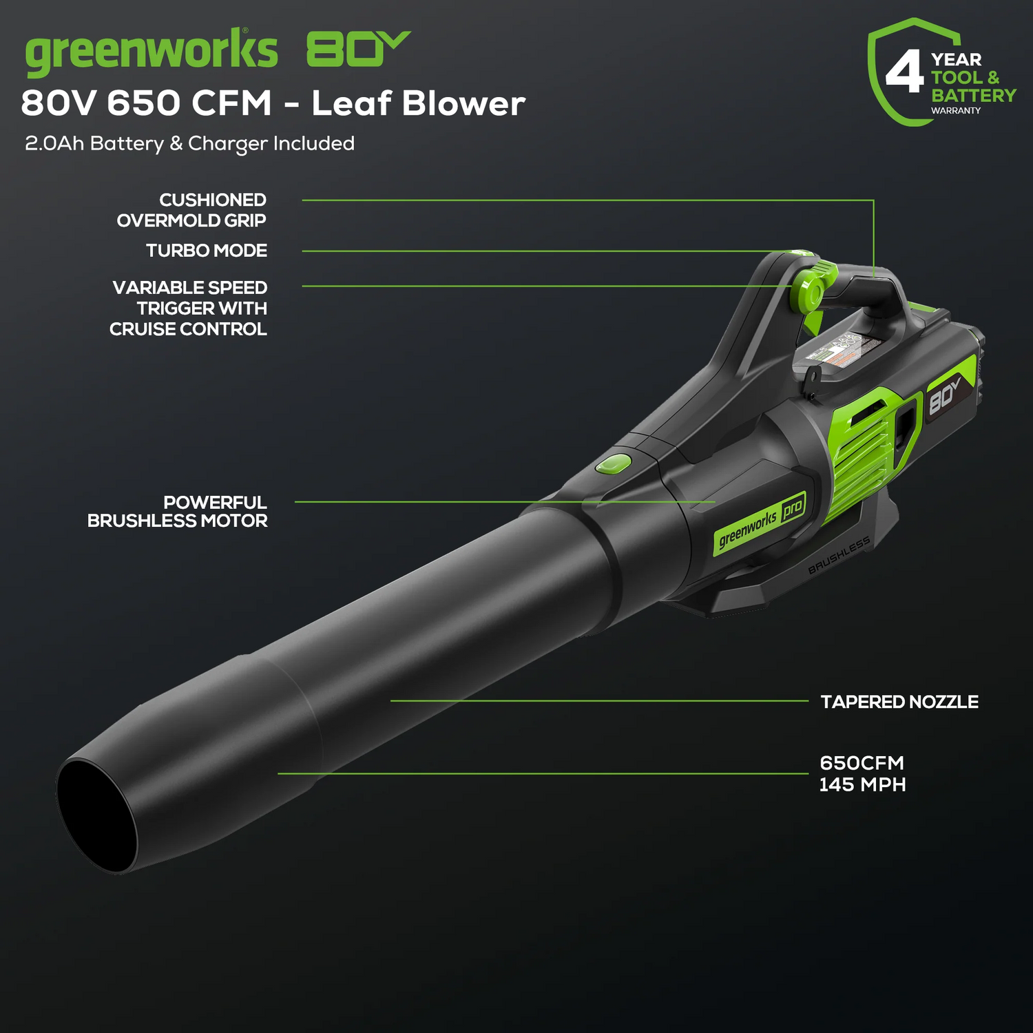 80V 650 CFM - 145 MPH Leaf Blower, 2.0Ah Battery and Charger Included