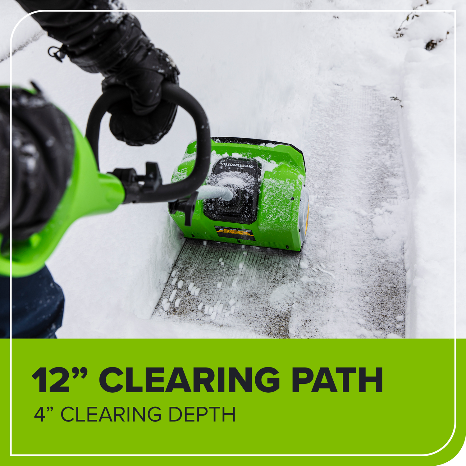 Welcome to a Life. Powered. by Greenworks. You will be thrilled to see that first snowflake of the season when you know this Greenworks 8A 12" Electric Snow Shovel is hanging out in your shed. With a 12" clearing path and a 4" clearing depth, this shovel gets the job done when life sends a blizzard. It discharges snow up to 20' and clears 300 lbs. of snow per minute. This Greenworks shovel has an ergonomic design for balance and comfort and an adjustable auxiliary handle for great control. Although it will make you want to stay out and shovel all day, this 8A Corded Snow Shovel Thrower from Greenworks cuts down on shoveling time and effort and gives you more time to be inside by the fire sipping on a hot cup of cocoa. Backed by a 3-year warranty, you can ensure we've got your back!