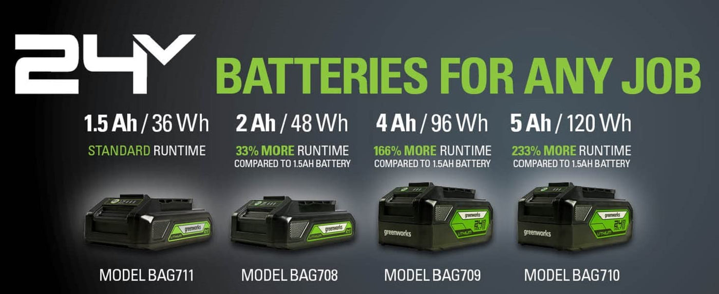 The Greenworks 24V lithium-Ion battery has an LED indicator which displays the remaining power. These high-performing batteries are fast charging and boast reliable charging without loss of memory or power. A 2.0Ah battery will be fully charged in 90 minutes and 80% charged in only 50 minutes.