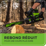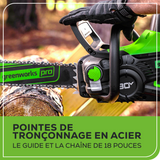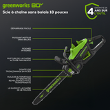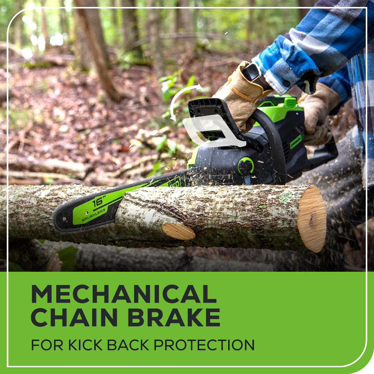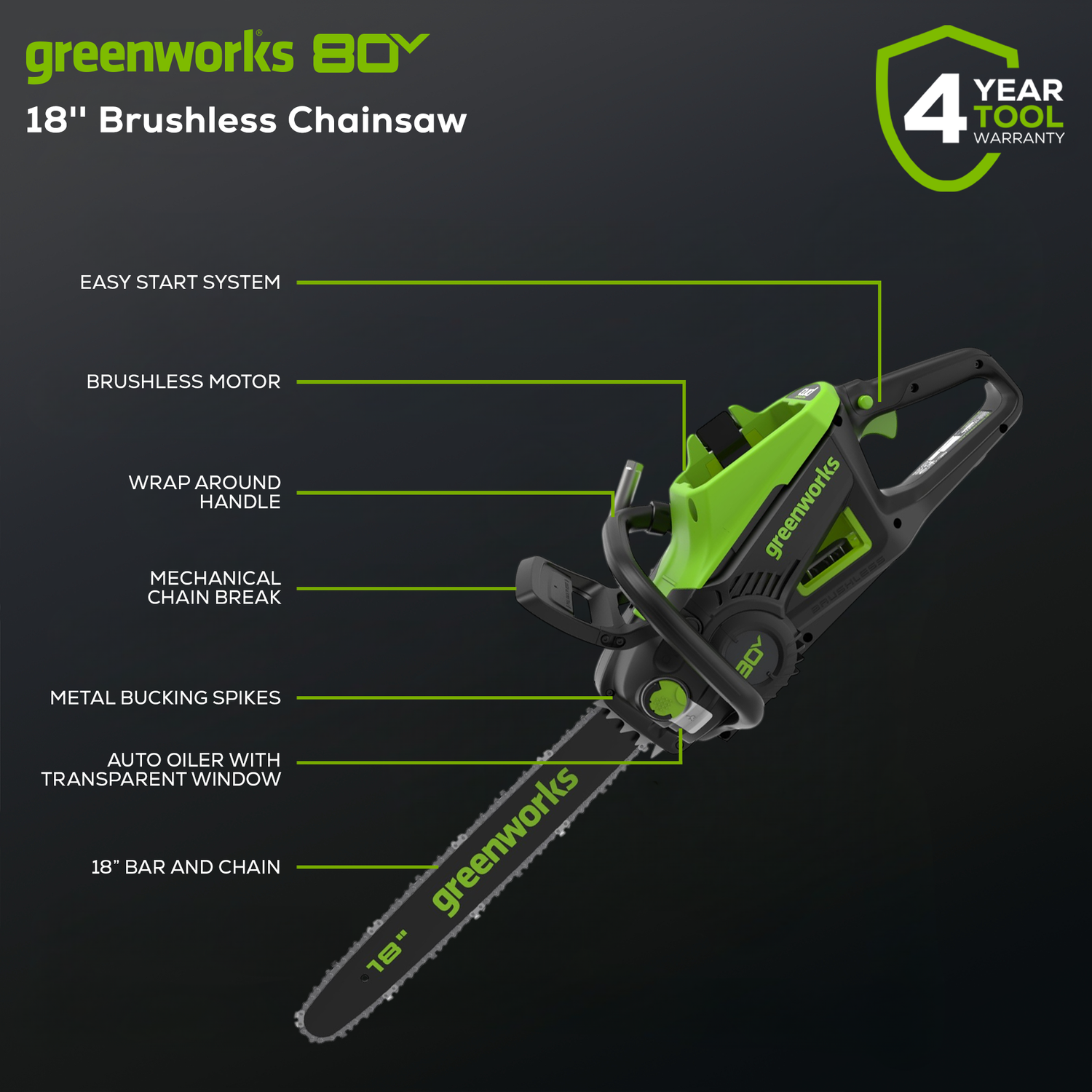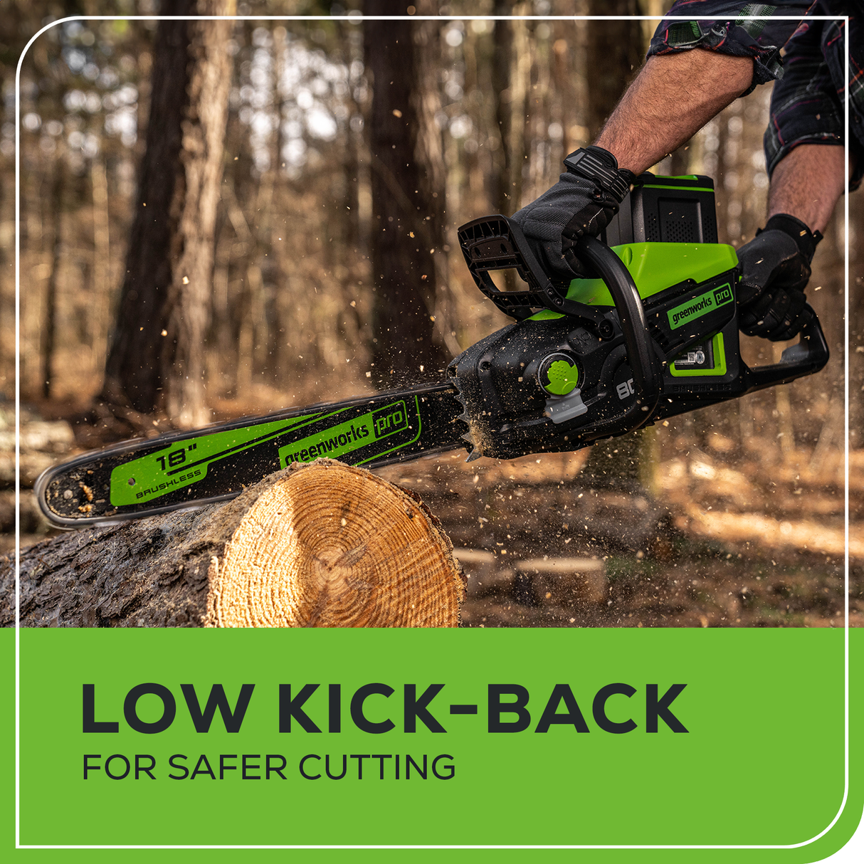 The Greenworks lineup features a variety of high-performance 80V tools that allow you to ditch your gas tools for an innovative, eco-friendly alternative. This Greenworks 80V 18" Brushless Chainsaw has the equivalent power of a 45cc gas engine, without the hassle of gas and fumes. This chainsaw starts at the push of a button and can make up to 150 cuts through a 4" x 4" piece of pressure treated lumber in one single charge of the 80V 2.0 Ah battery (not included). The quick charger (not included) will recharge the battery in approximately 30 minutes, putting you back to work in no time.