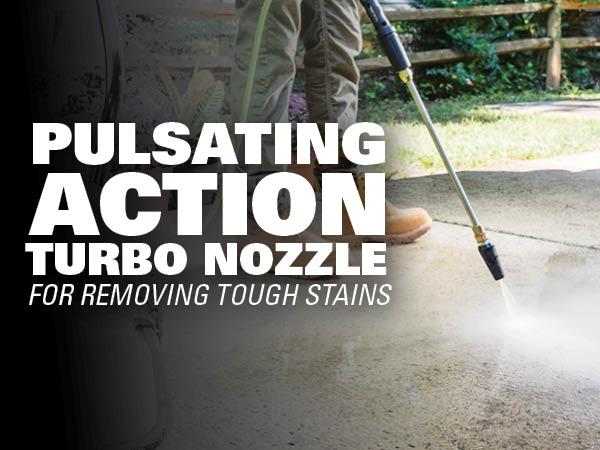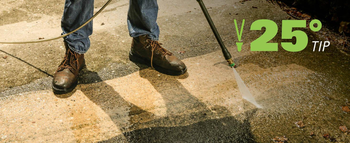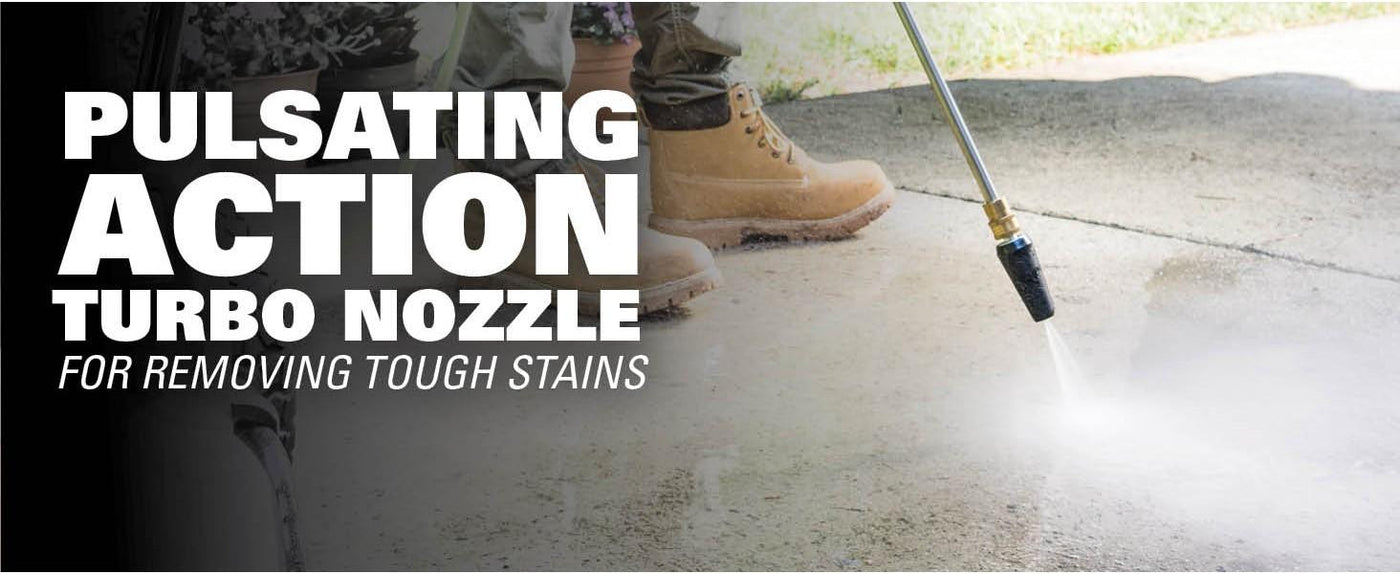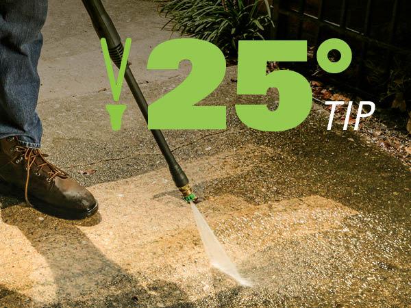 0° - Red nozzle: This nozzle is typically used for removing tough stains like rust and debris from concrete and metal. You can also use it for removing caked on mud from heavy construction, farm, or lawn equipment. Do not use this nozzle on wood or home siding or for washing a car because this stream is very strong and powerful and can damage a soft surface. 15° – Yellow nozzle: The yellow pressure washer tip provides high versatility with its 15-degree angle tip. Referred to as the washing tip, because it provides adequate pressure to remove dirt from surfaces but is designed to not damage many surfaces. This pressure washer tip is designed for “sweeping” foliage or debris given its wide angle. This tip is versatile due to its wide area of cleaning and strong pressure application. 25° – Green nozzle: The green colored, 25-degree nozzle is best used to sweep away dirt and mud. Use it to sweep away leaves from decks, driveways, and sidewalks. It can also be used for removing light mildew stains and removing algae and bacteria build up from pools. 40° – White nozzle: The white 40-degree tip, referred to as the “fan” tip creates the widest area of cleaning with relatively low pressure. This pressure washer tip is best used for light or delicate cleaning applications. It is recommended for light cleaning on wood decks and other soft or delicate surfaces. 75° Soap – Black nozzle: The black colored nozzle is a low-pressure detergent nozzle. You use this when applying your preferred detergent for your cleaning projects. Turbo Nozzle: The nozzle rotates in a zero-to-15-degree spray pattern in a circular motion to break down tough dirt and grime. The spray pattern can cover area of 4 to 8 inches wide, depending on a distance between the tip and the surface being cleaned.